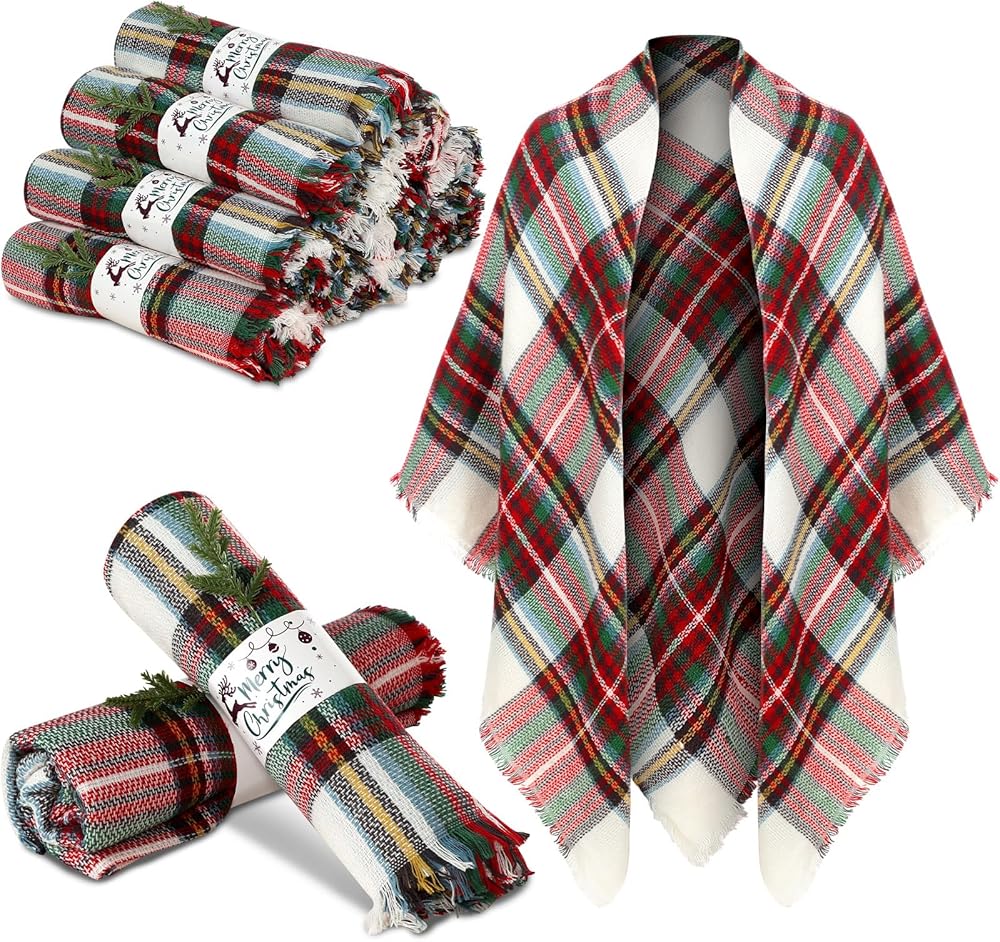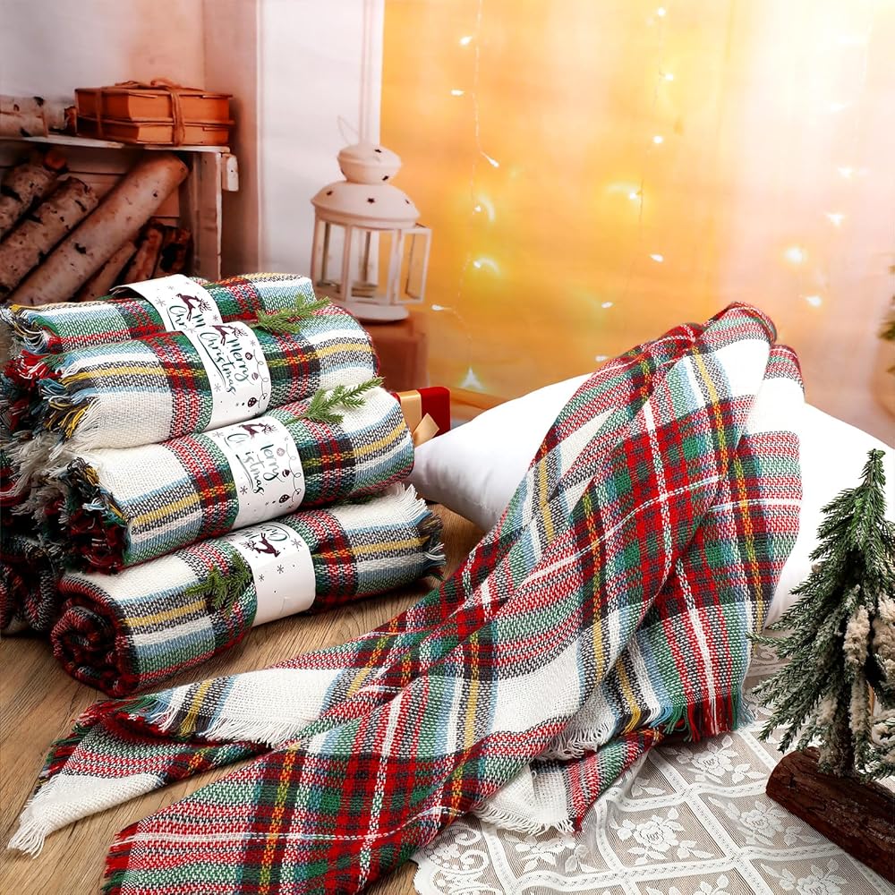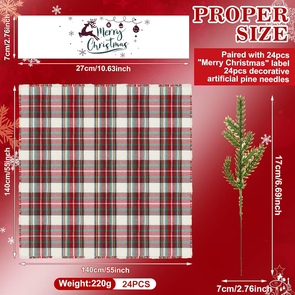 تصميم عصري: مجموعة كبيرة من 24 شال أحمر كلاسيكي، يأتي كل وشاح بطانية للعطلات مع ملصق احتفالي "Merry Christmas" وإبر صنوبر صناعية مزخرفة، مما يجعل هدية رائعة ومميزة