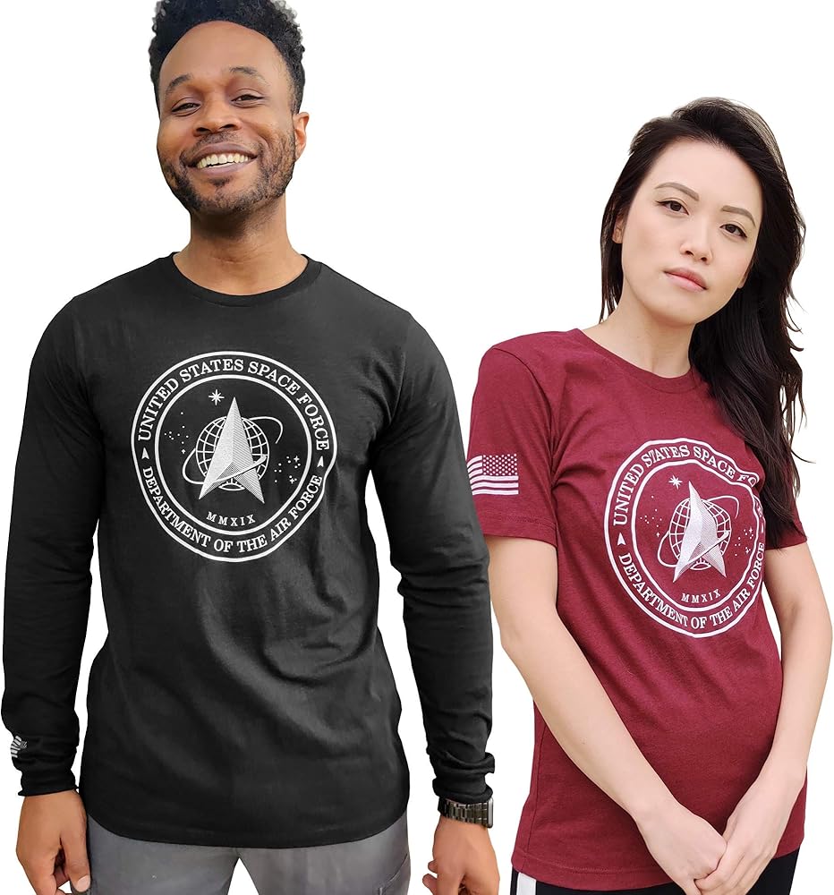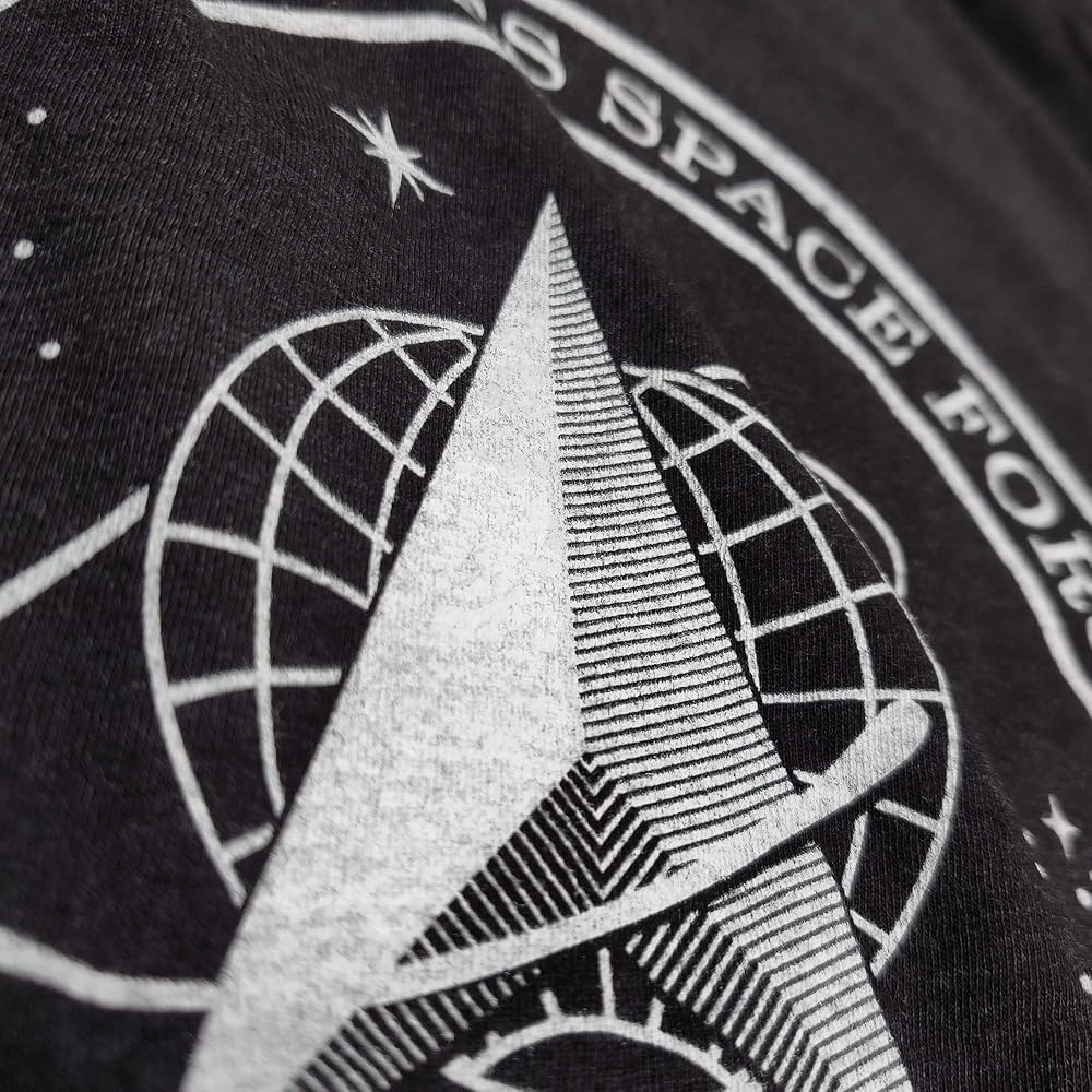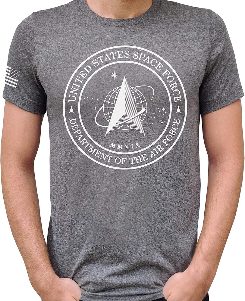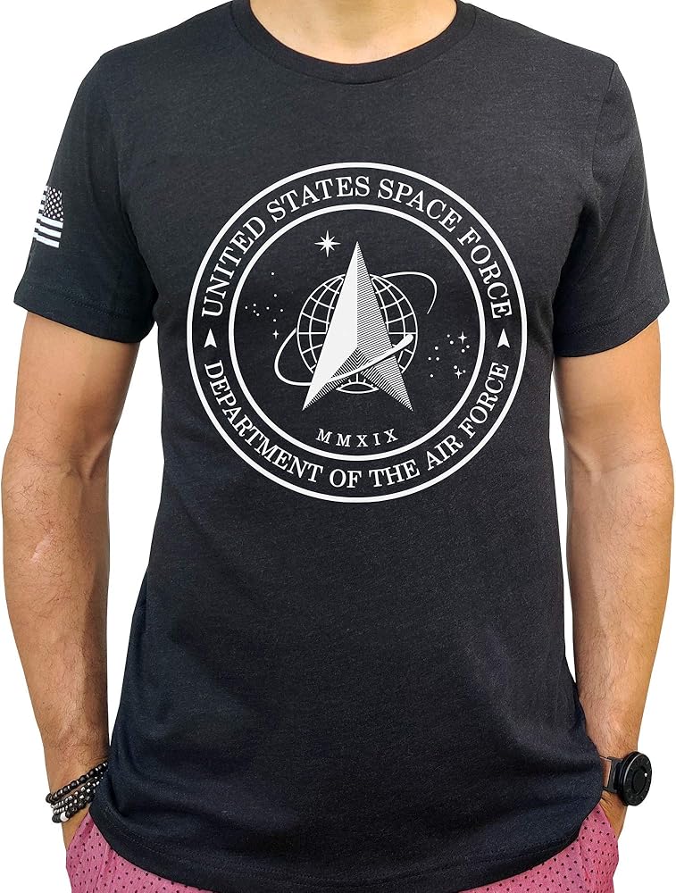 The graphic on the front is the brand new Space Force Logo. On the right sleeve is a print of the American flag. When on the right sleeve, the flag image is supposed to be reversed, as though the flag is waving in the wind as you charge into battle.