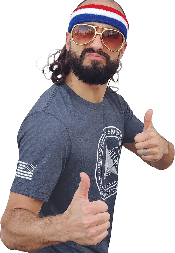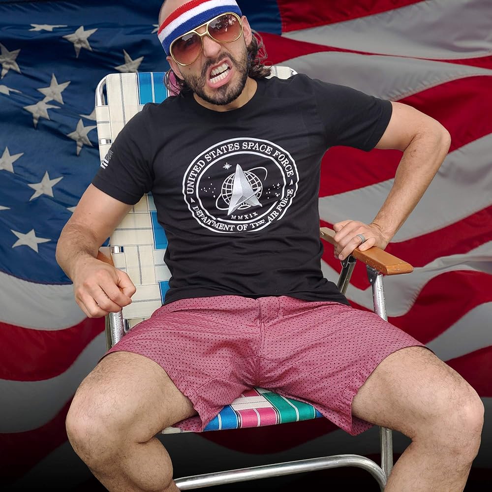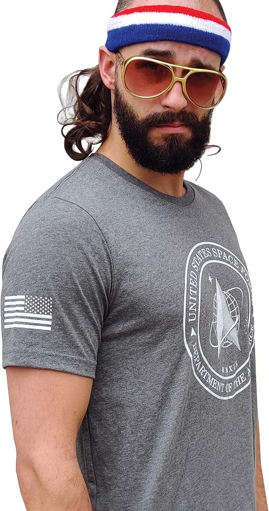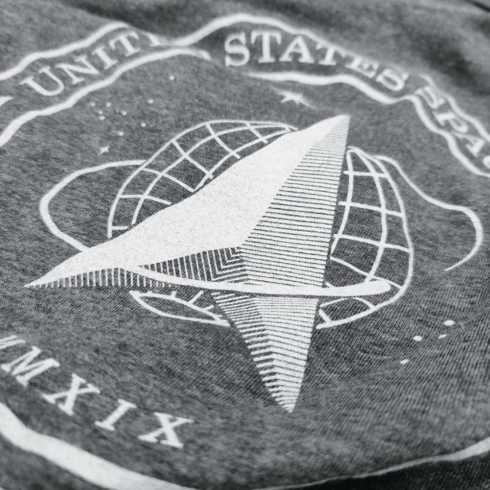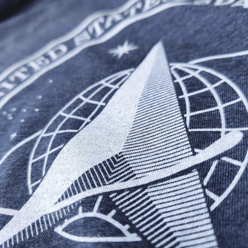 The graphic on the front is the brand new Space Force Logo. On the right sleeve is a print of the American flag. When on the right sleeve, the flag image is supposed to be reversed, as though the flag is waving in the wind as you charge into battle.