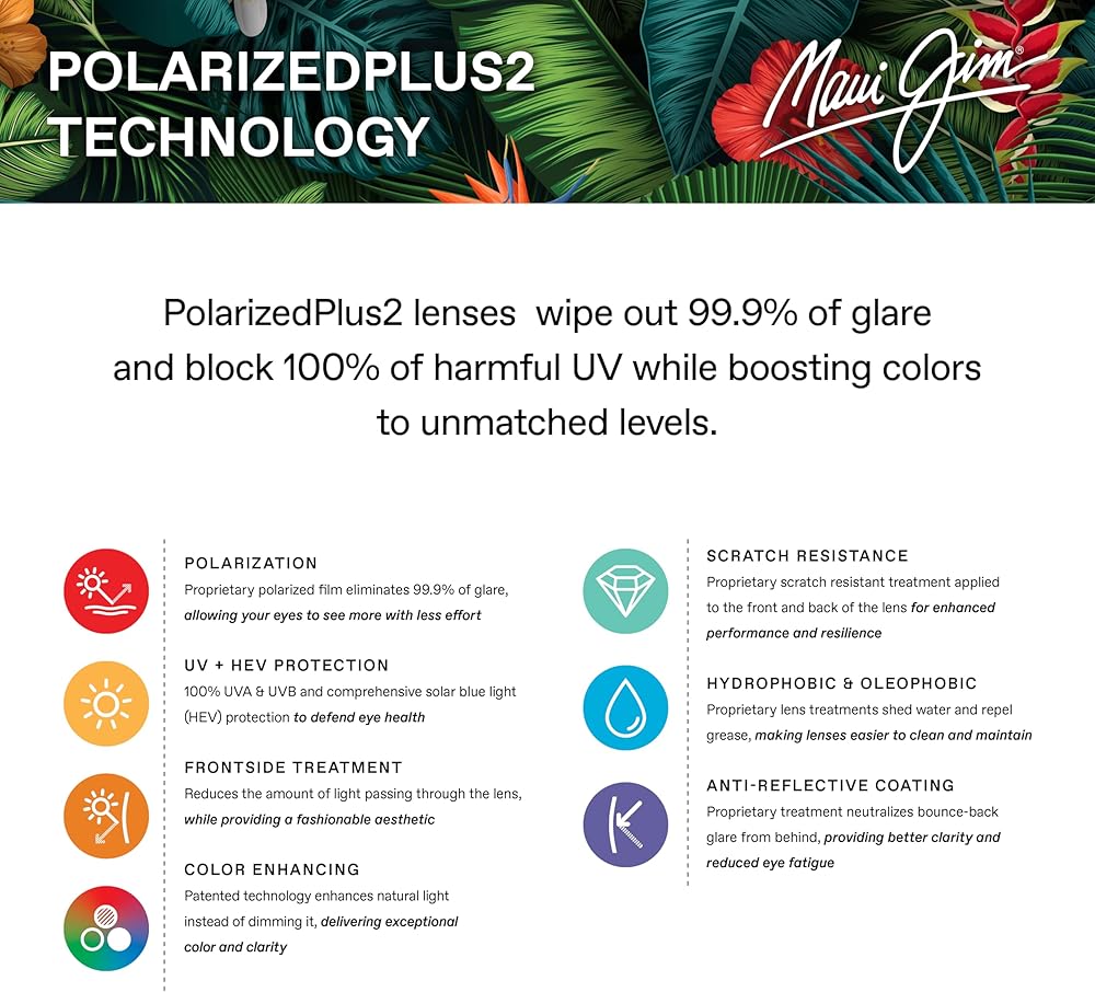 All Maui Jim sunglasses feature PolarizedPlus2 lens technology that go beyond shielding your eyes from glare and harmful UV rays by enhancing colors to reveal the true beauty of the world around you