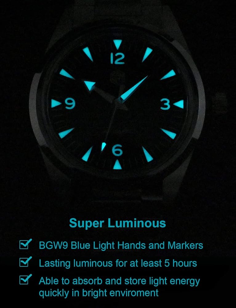 • 𝗕𝗚𝗪𝟵 𝗟𝘂𝗺𝗶𝗻𝗼𝘂𝘀 𝗪𝗮𝘁𝗰𝗵: It's hands and hour markers are featuring Super Luminous BGW9 blue light, which can last for at least 5 hours in dark and is able to quickly absorb and store light energy in a bright environment. Luminous wristwatches allows you to grasp the time without fear of the dark.