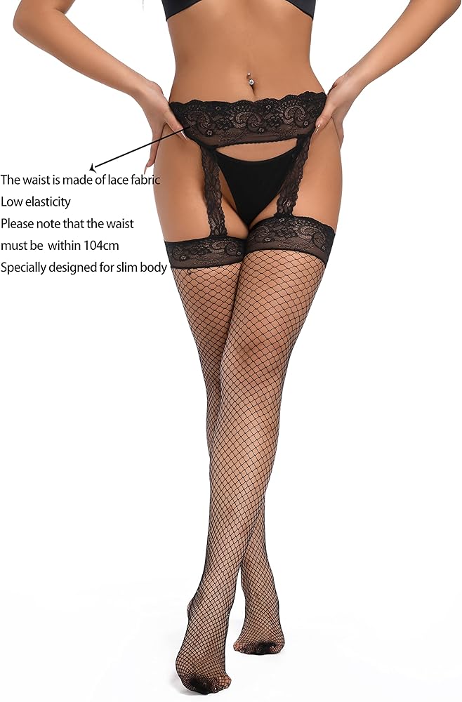 جوارب IMMIGOSE النسائية الضيقة ذات شبكة صيد السمك مع حزام رباط أسود من الدانتيل - (S-M)