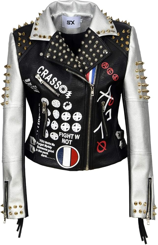 - المميزات: سترة جلدية كلاسيكية مخصصة للسيدات. معطف جاكيت بسحاب من الجلد الصناعي مزين ببرشام، طباعة جلد الفهد، معدن. بدلة معطف برشام لملابس الربيع والخريف والشتاء.