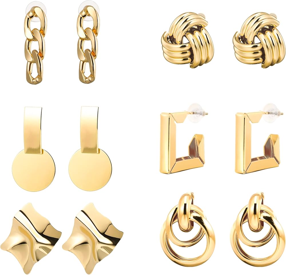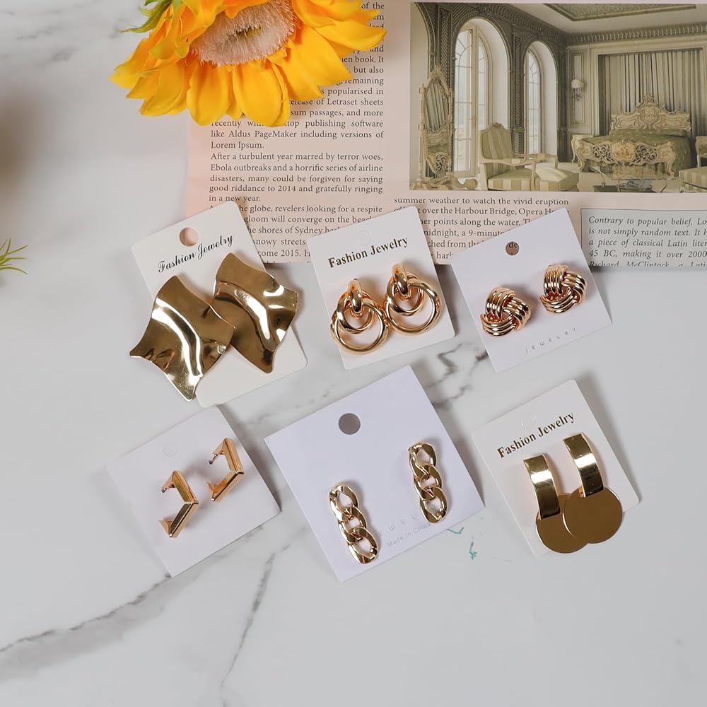 مجموعة أقراط ذهبية مميزة: سوف تحصلين على 6 أزواج من الأقراط الذهبية المميزة بأنماط مختلفة، مثل الأقراط الملتوية، والأقراط الدائرية، وأقراط سلسلة الارتباط أو الأقراط الهندسية والمزيد. رقيقة وأنيقة، أنماط مختلفة يمكن أن تلبي احتياجاتك في الارتداء والتغيير والمشاركة للحياة اليومية أو الحفلات.