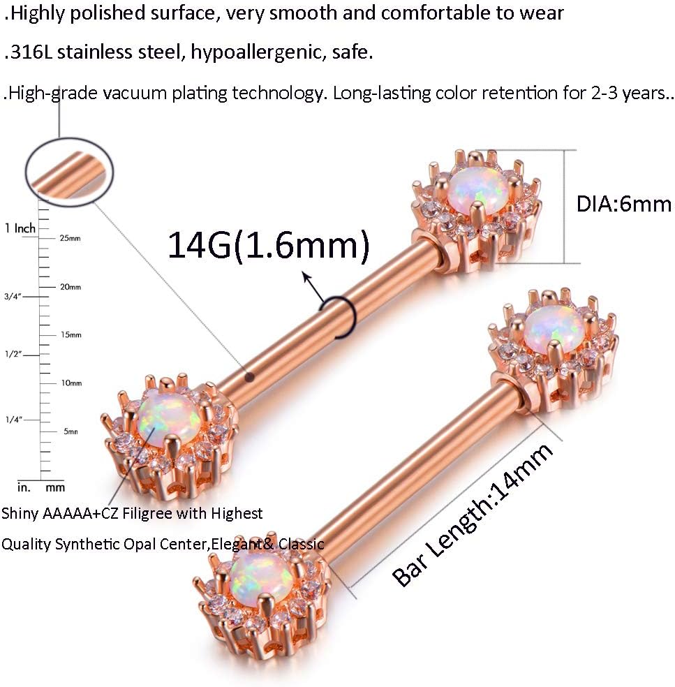 Gabry&jwl®14G 316L Stainless Steel Nipple Rings Barbell Opal Center Clear CZ Filigree Nipplerings Body Piercing Jewelry(14mm Bar)