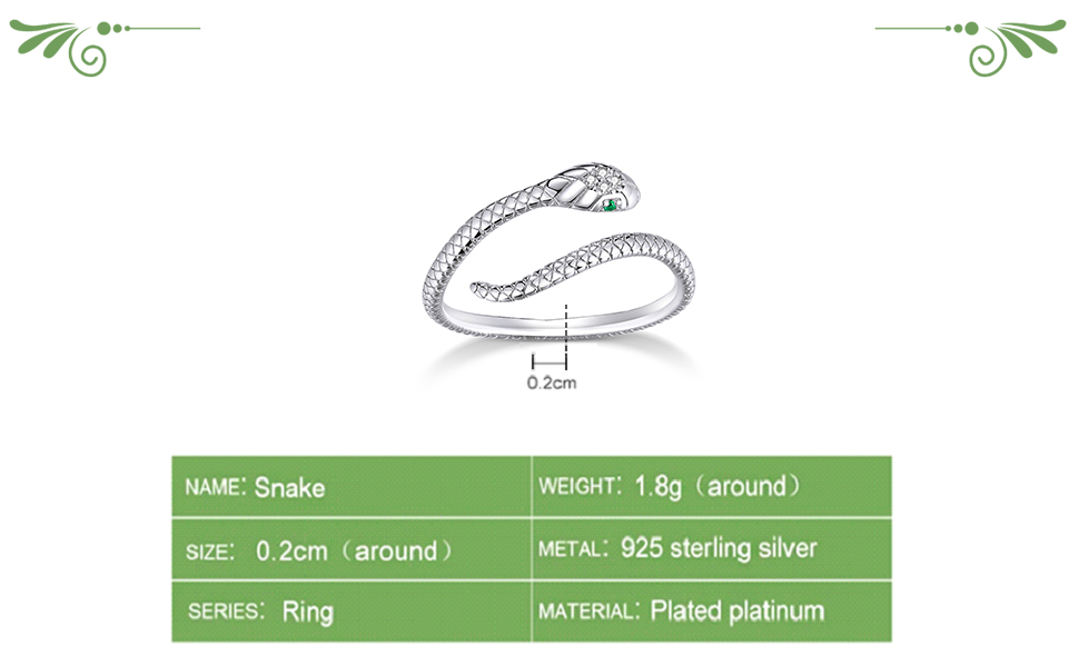 • هدية مثالية: يمكن وضع خاتم الثعبان في معظم المناسبات، يمكنك ارتداؤه لحضور الحفلات والاحتفالات، كما أنه مناسب للارتداء اليومي، ويجعلك تبدين أكثر جمالاً ولافتة للنظر. سيكون خاتم الثعبان هذا هدية خاصة للأصدقاء والزوجة والابنة والأخ والأم والأب والأخت، هدية مثالية للكريسماس والتخرج وأعياد الميلاد وعيد الشكر والذكرى السنوية وعيد التخرج وعيد الأم.