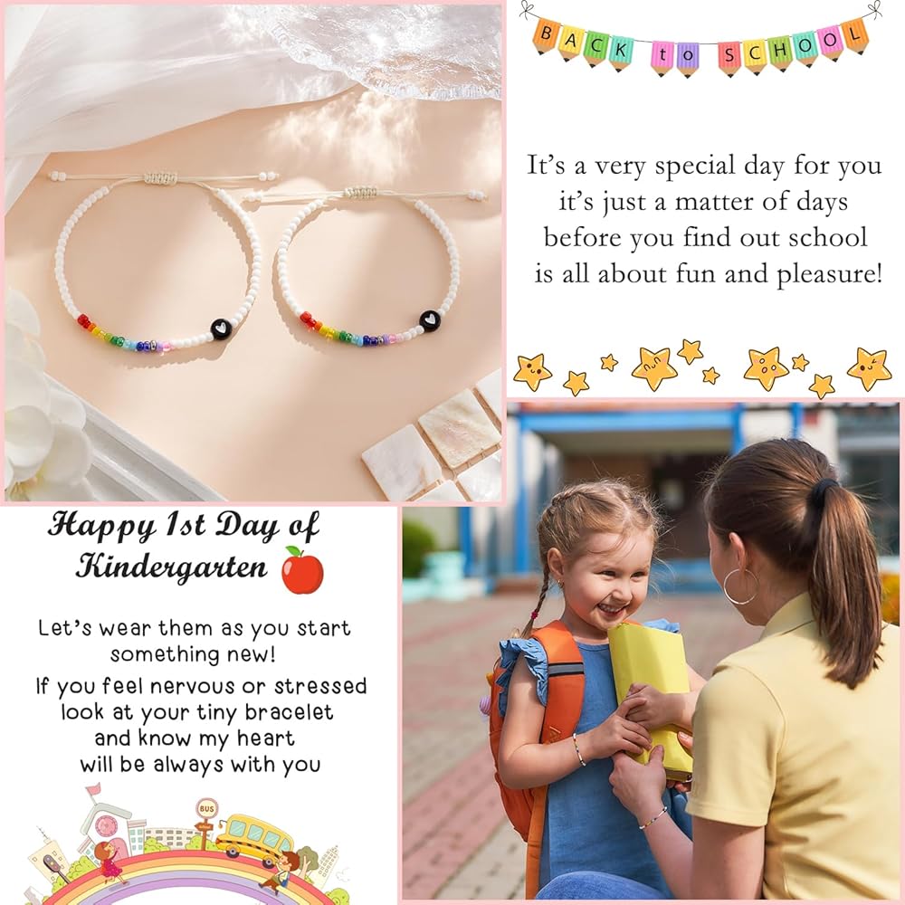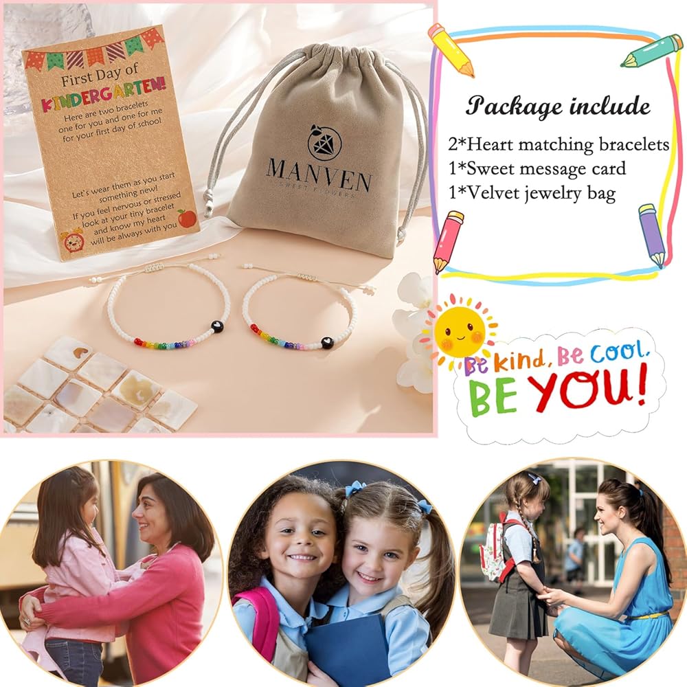 مجموعة أساور العودة إلى المدرسة - احصل على هذه الأساور المتطابقة على شكل قلب للأم والابنة لمساعدة طفلتك الصغيرة في القلق من الانفصال، وتذكر أن الأم تفكر دائمًا بها ودائمًا معها، تخيلي مدى فخر فتياتك الجميلات بارتداء أساور متطابقة. مع الأم!