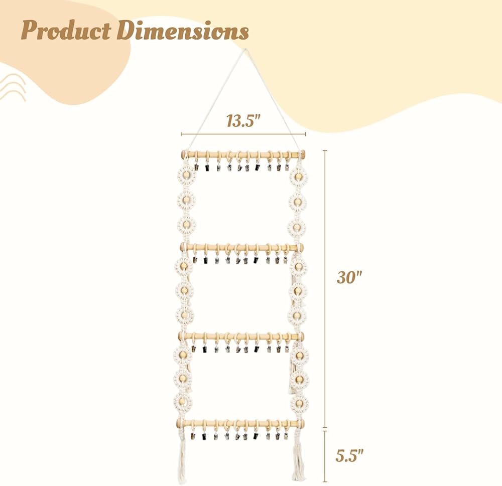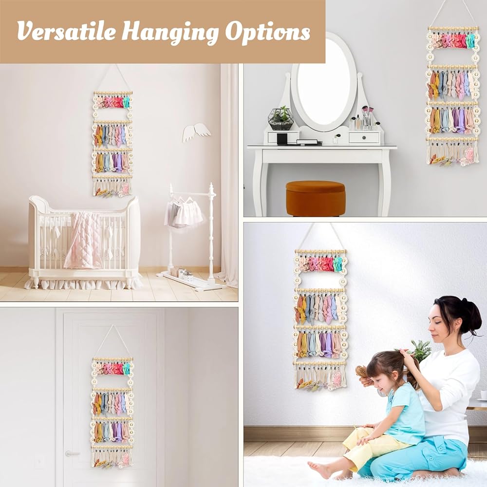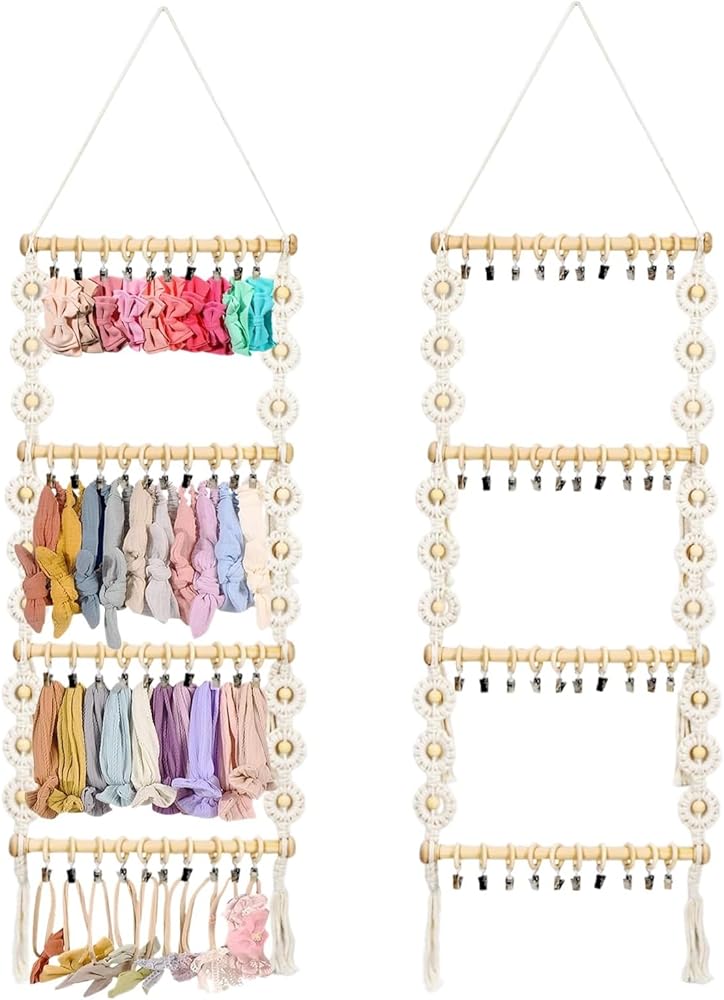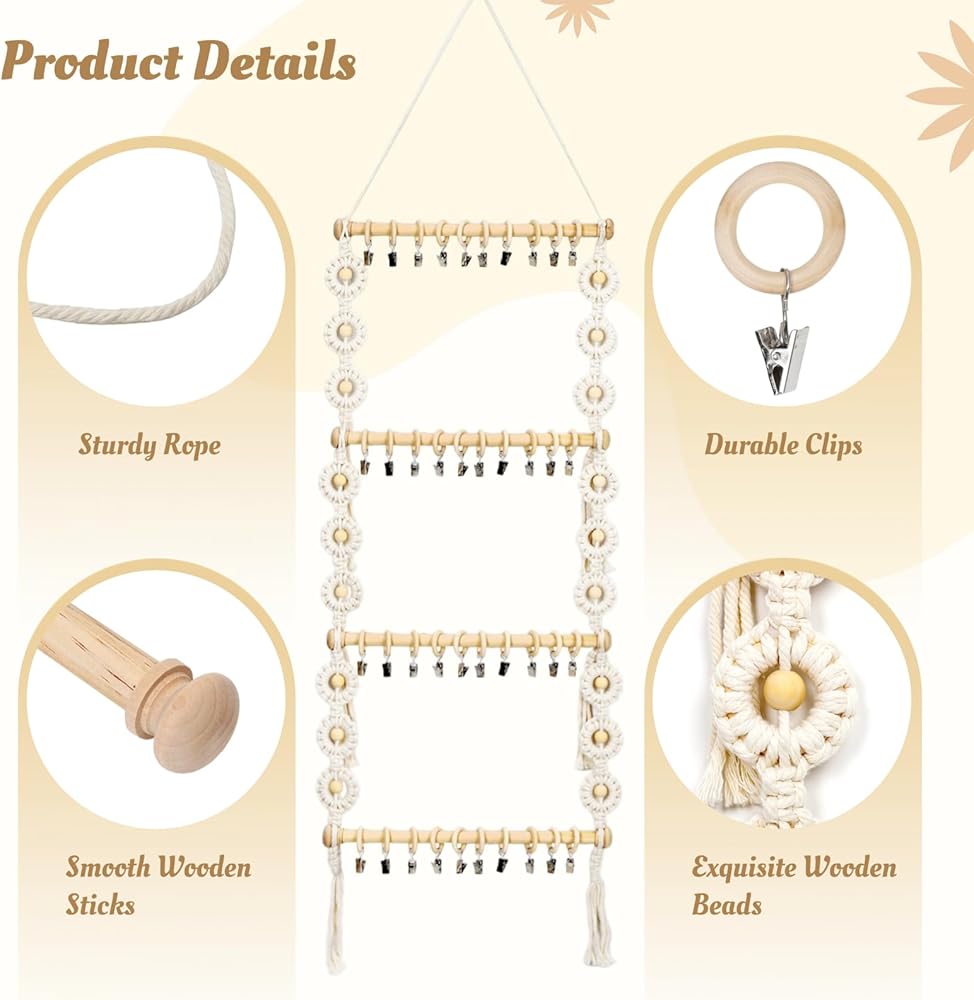 【سهل التجميع】مصنوع من 6 حبال قطنية و4 عصي خشبية و40 مشبكًا وخطاف واحد وحبل تعليق، منظم عصابة الرأس هذا سهل التجميع. ما عليك سوى تحريك المشابك الخشبية على العصي الخشبية، ثم ربط الحبال القطنية على كل صف من العصي. يسمح لك الخطاف المتضمن بتعليق رف ربطات الشعر بسهولة على الحائط.