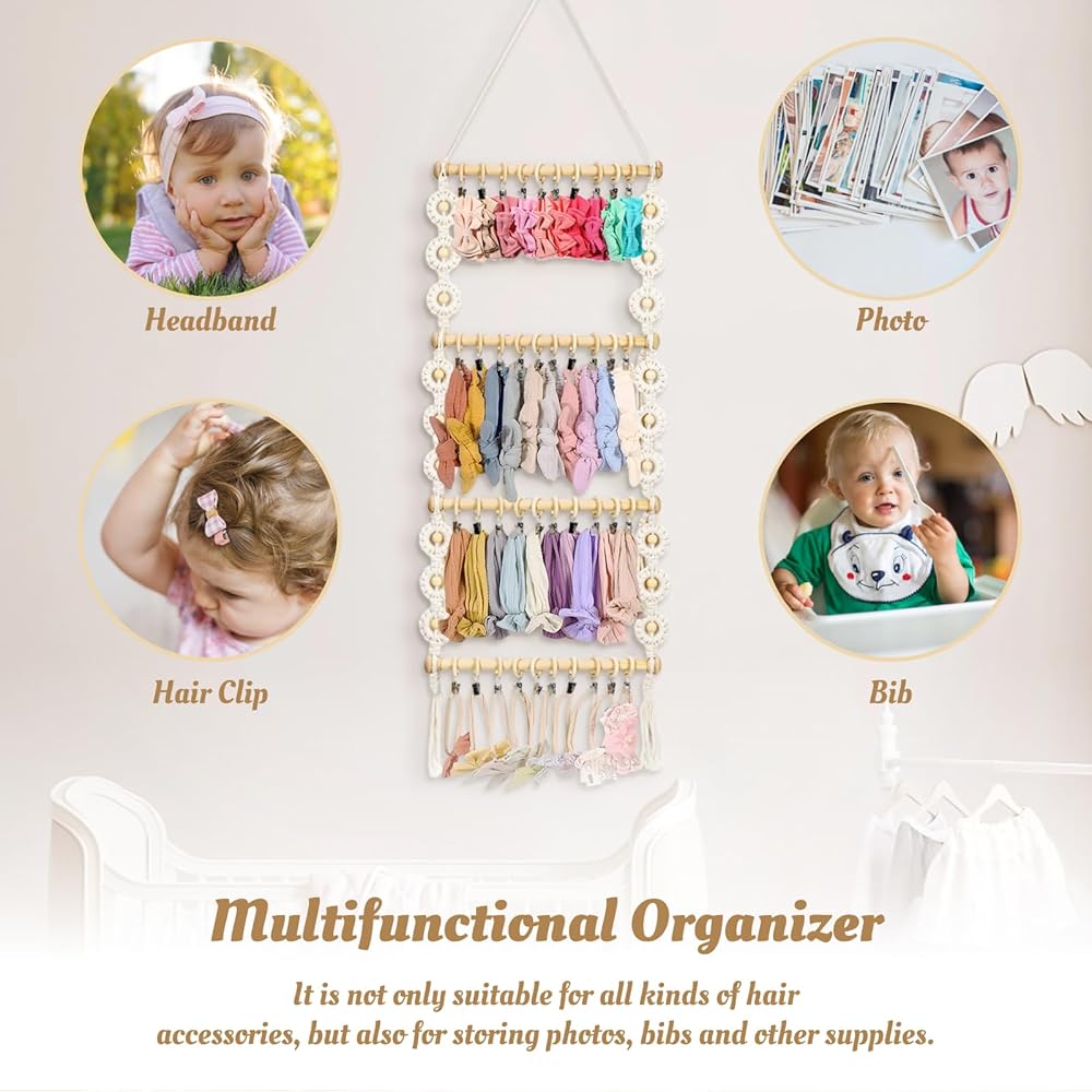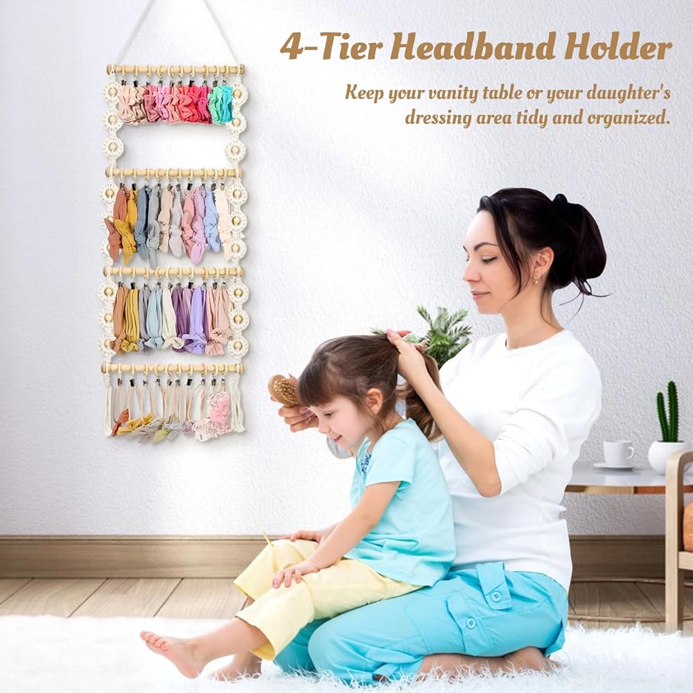 حامل عصابة رأس IKITEE، منظم أقواس لعصابة رأس فيونكات الشعر، شماعة حامل إكسسوارات الشعر، تخزين كبير لأقواس الشعر الخشبية للفتيات الصغيرات ديكور جدار غرفة الطفل