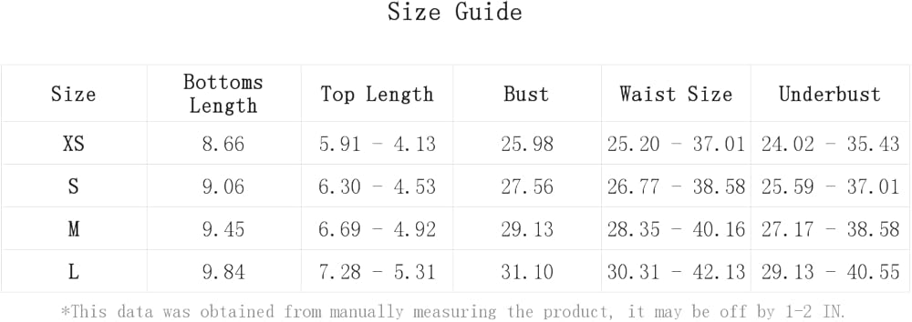 XS:Bust:26.0IN,Top Length:5.9/4.1IN,Underbust:24.0-35.4IN,Bottoms Length:8.7IN,Waist Size:25.2-37.0IN