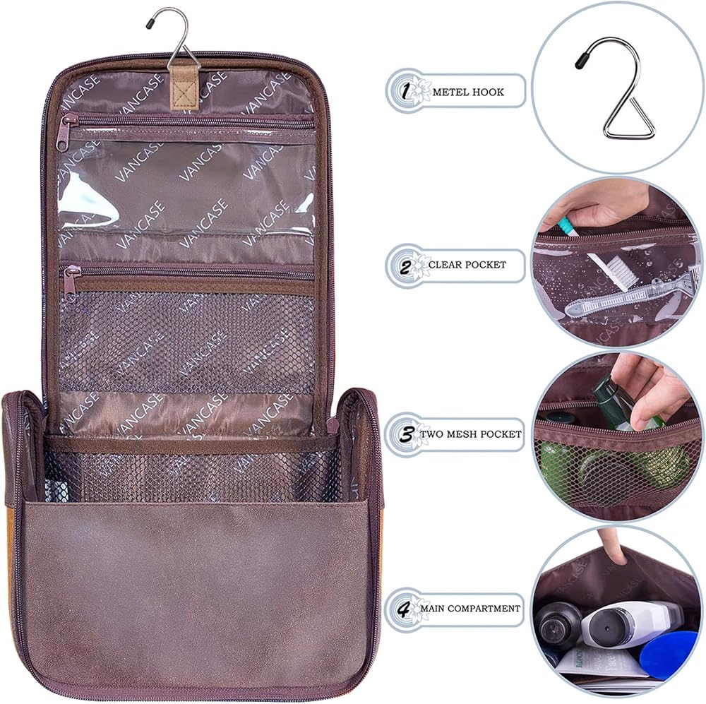 【مادة متينة مختارة】 حقيبة مستحضرات التجميل المعلقة هذه مصنوعة من جلد البولي يوريثان العتيق الجذاب، وهو متين ومقاوم للماء ويمكن استخدامه حتى في الظروف الرطبة. يمكن لبطانة طباعة الشاشة والمواد الخاصة المقاومة للصدمات المضافة بالداخل أن تحمي أغراضك بشكل مثالي وفعال