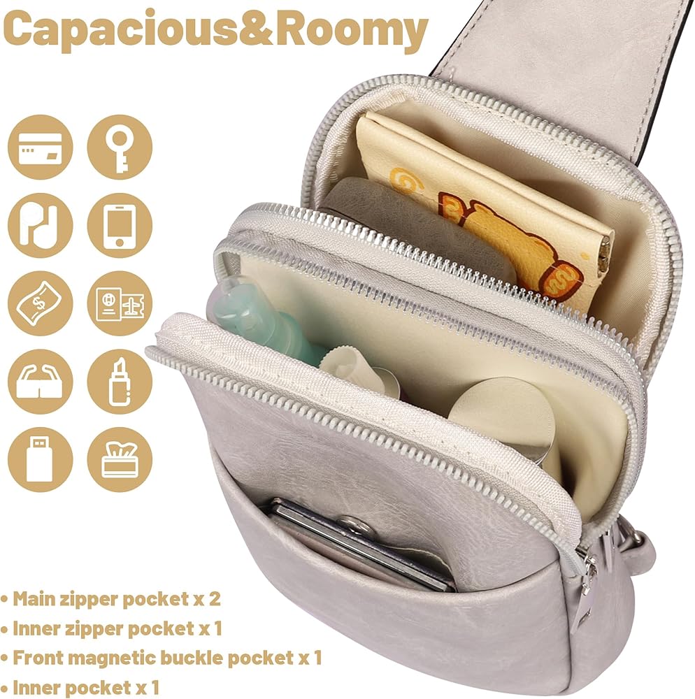 【Spacious Storage】The sling bag features 3 compartments, two of which have zippers and one with a magnetic snap closure, providing ample space for all your belongings. You can conveniently store essentials(cosmetics, credit cards, keys, phone, passport, and more).