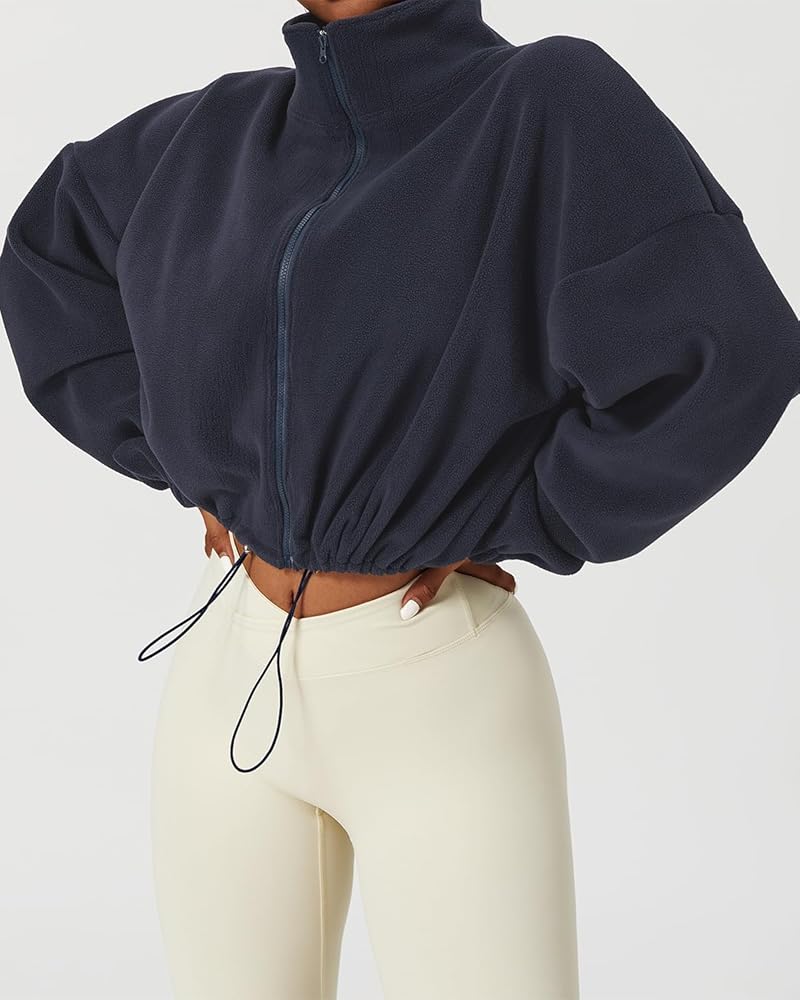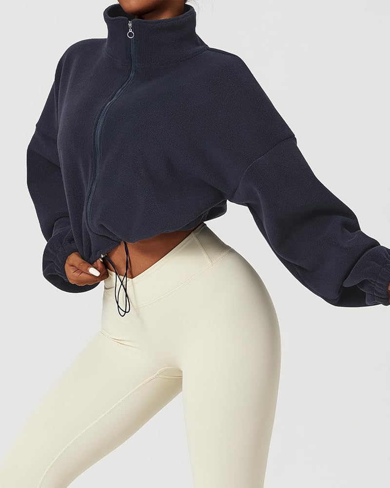 Stay cozy and fashionable in our women's fleece zip up crop jacket. Made with a blend of 95% polyester and 5% spandex, this jacket offers a super soft touch and brings warmth in temperatures above 32°F. Whether you need a comfortable layer after a workout or a trendy addition to your daily fashion, this highly polar fleece jacket has got you covered.