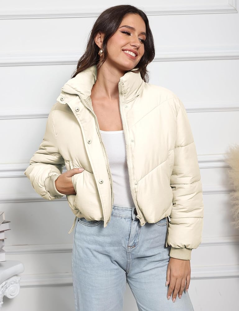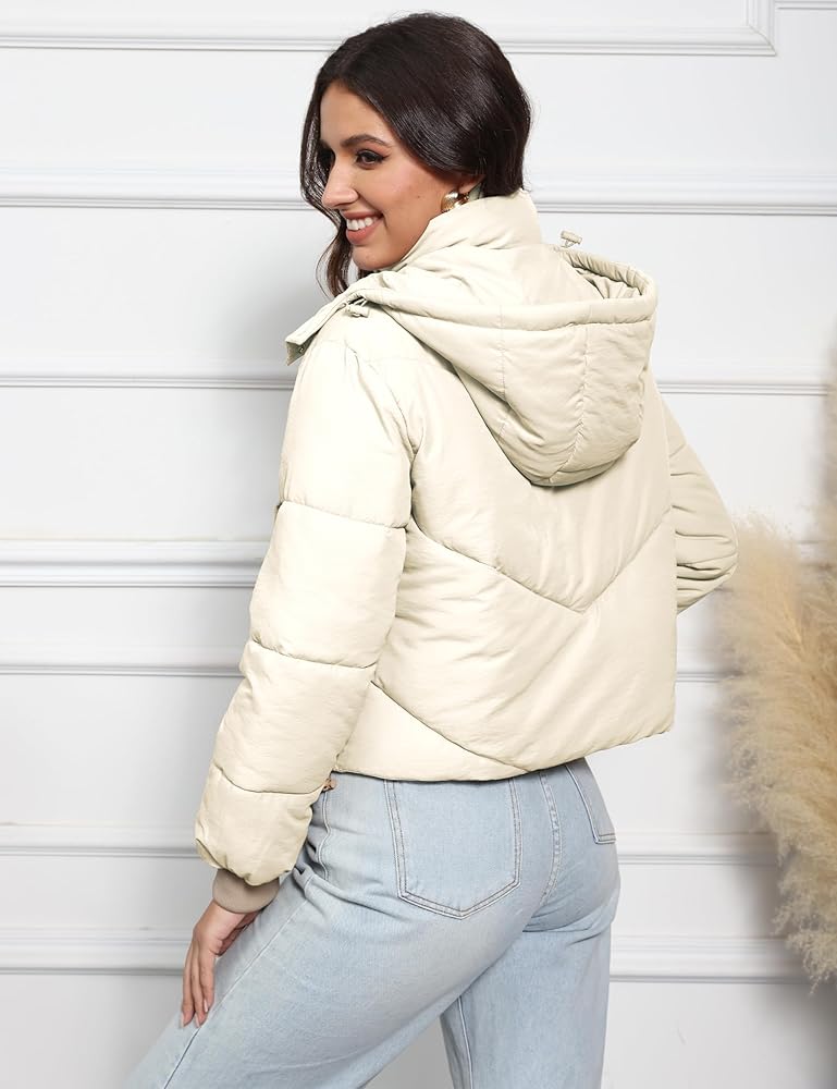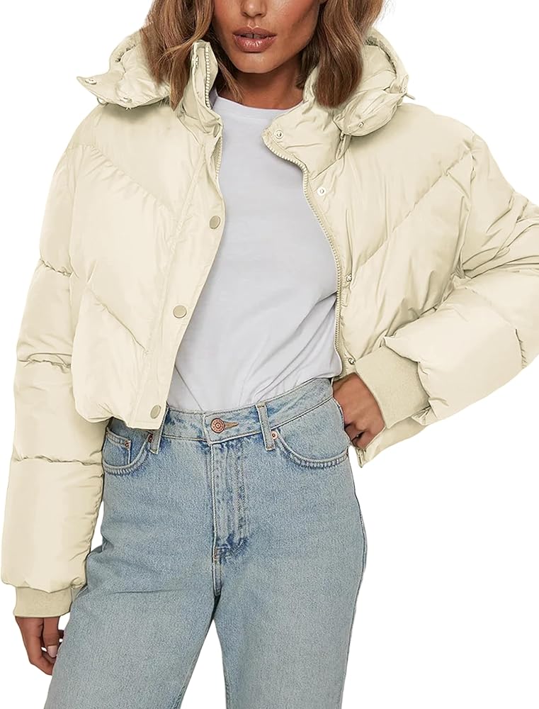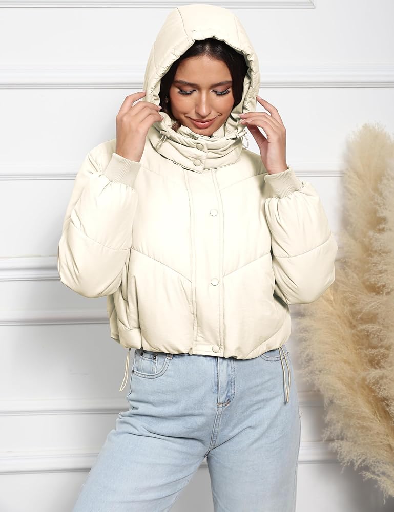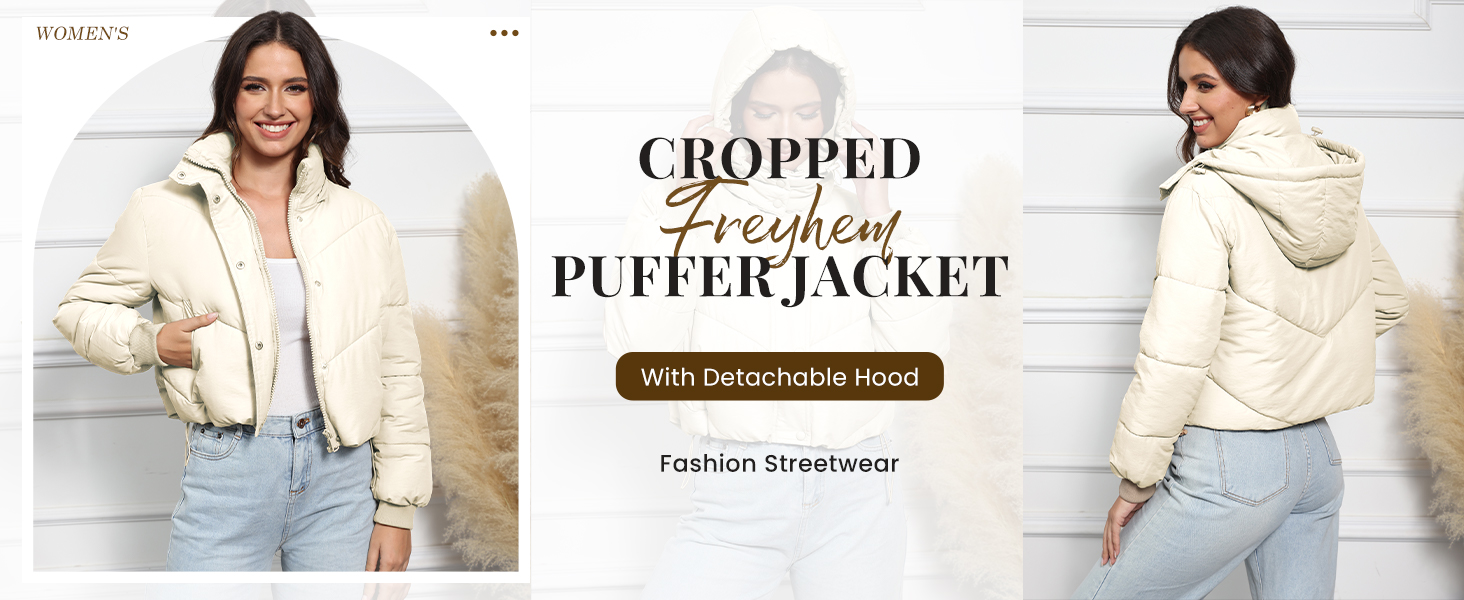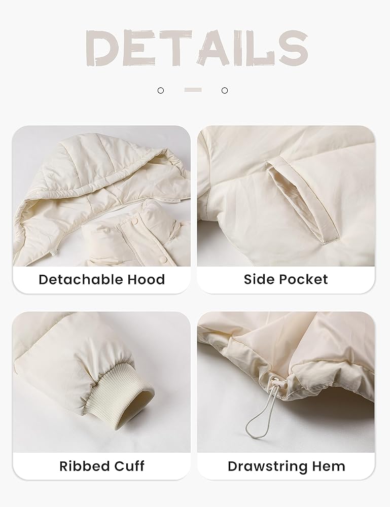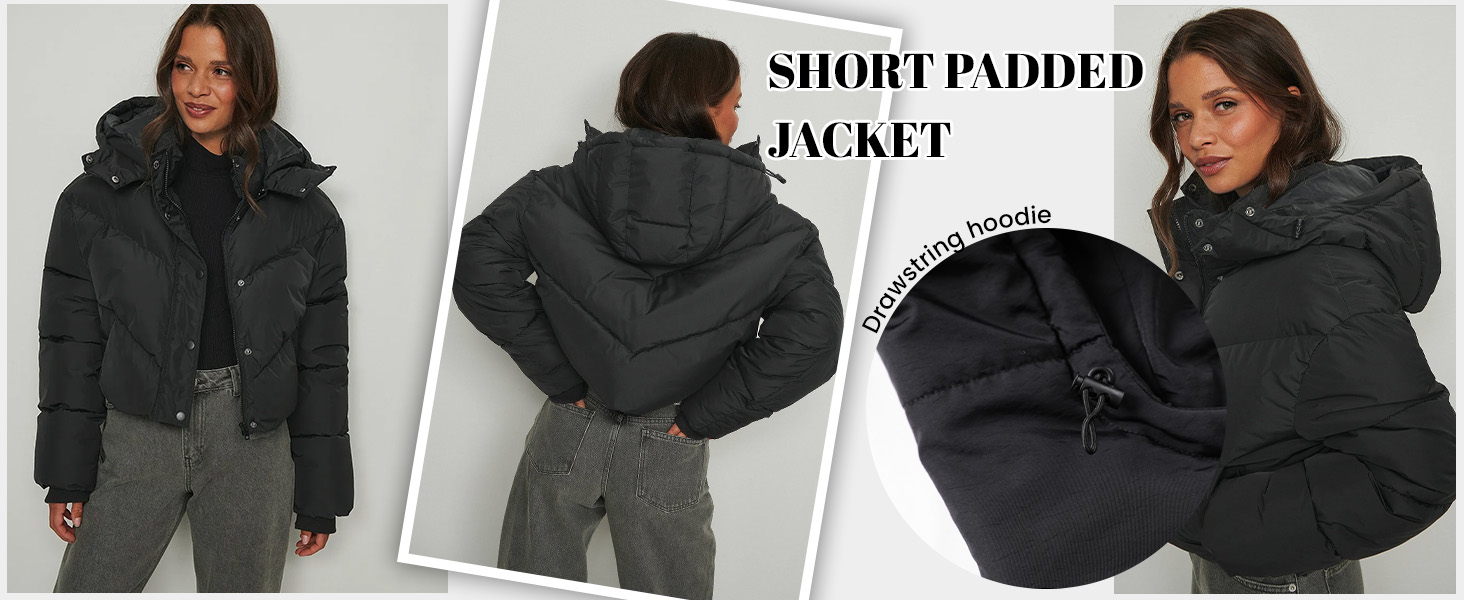 • التصميم: سترة منتفخة بغطاء للرأس تتميز بسحاب كامل مع زر كبس، وجيبين للتخزين الأساسي، وطول قصير، وأساور أكمام مرنة مشدودة، وحاشية برباط، ومعطف شتوي صلب لطيف وعصري