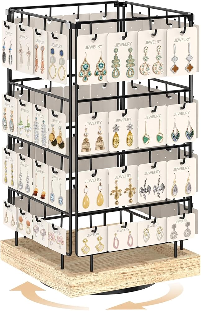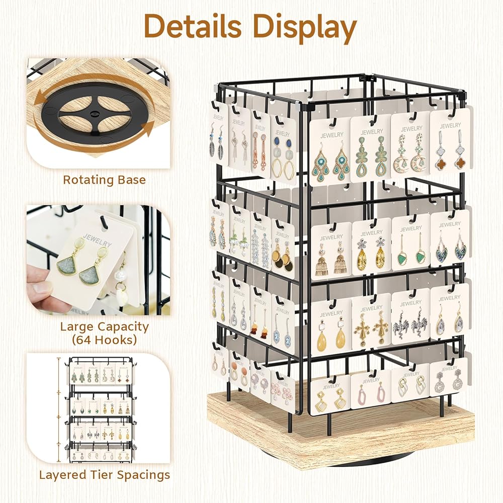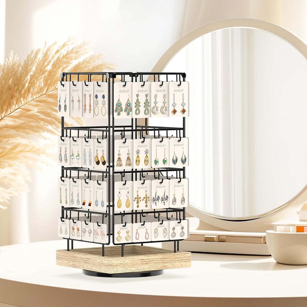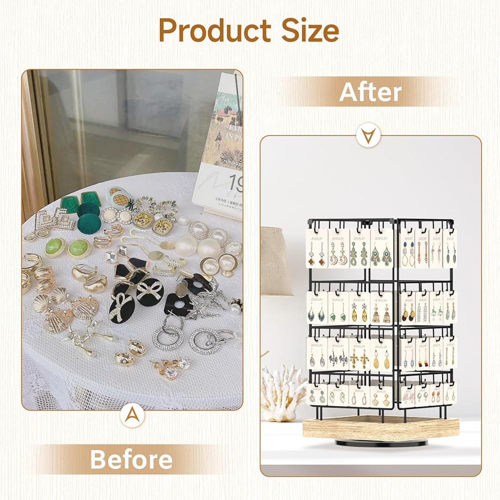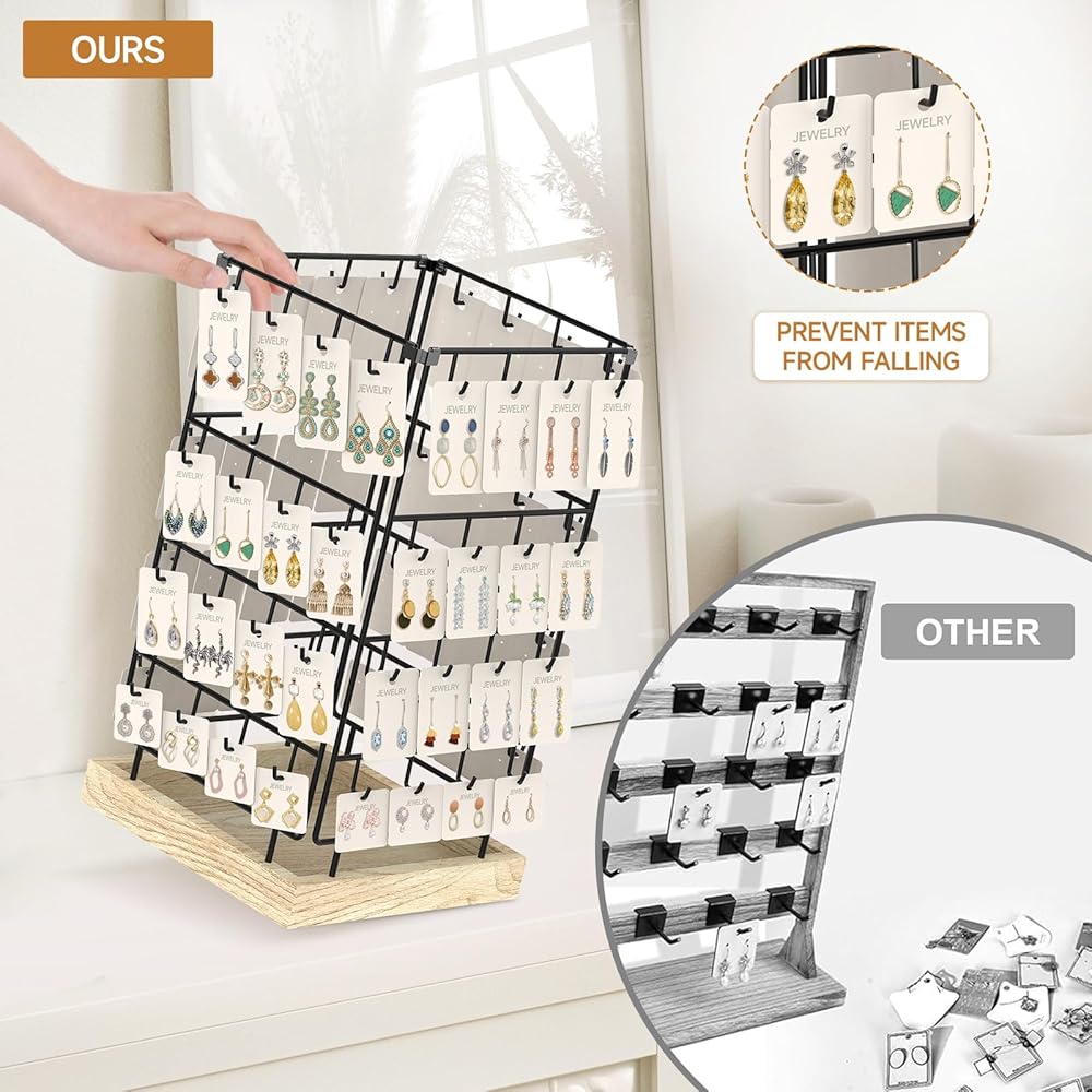 No matter which direction people walk from, they can see the eye-catching jewelrys on this earring holder stand. The can rotate on all sides to display the accessories hanging on it, and each hook can hold more than one jewelry card. This large-capacity earring display for selling makes it possible for customers to select a variety of jewelry.
