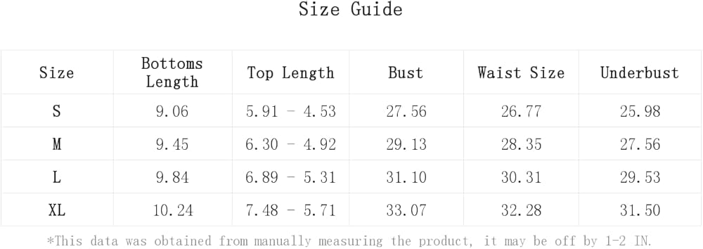XL: Bust: 33.1", Top Length: 7.5/5.7", Underbust: 31.5"