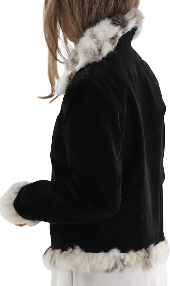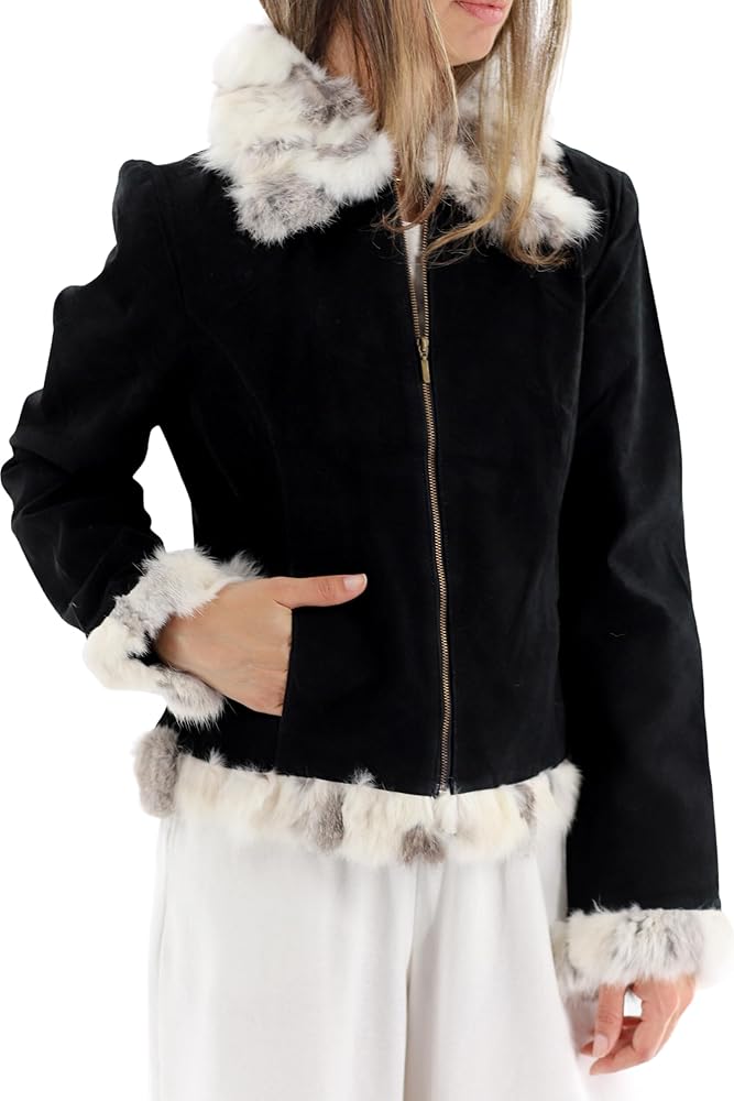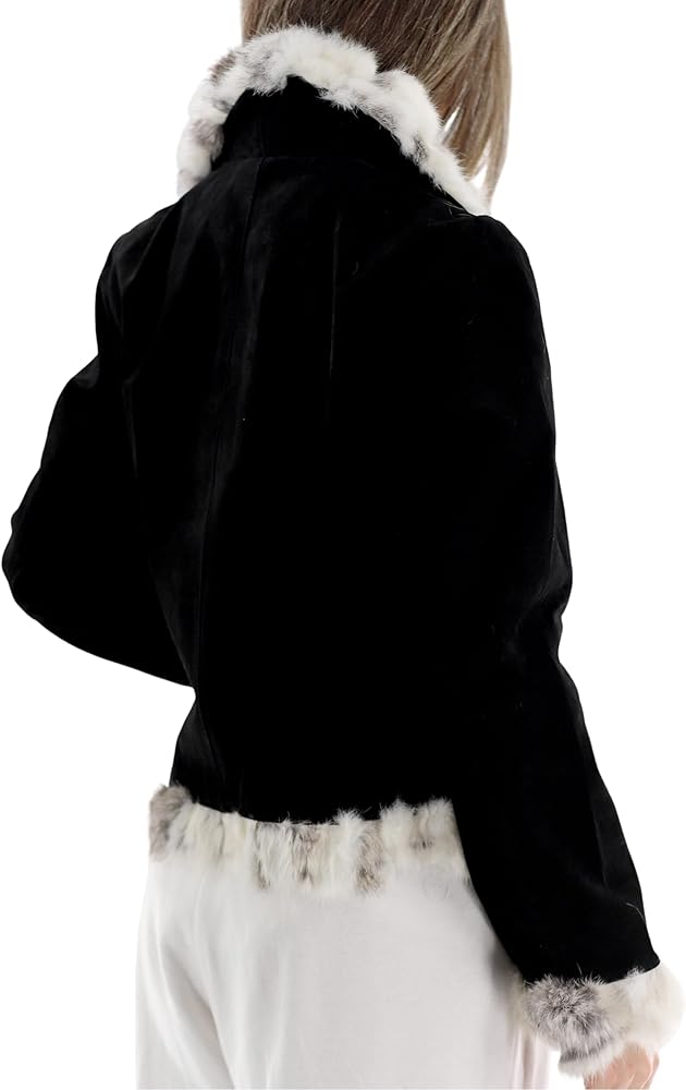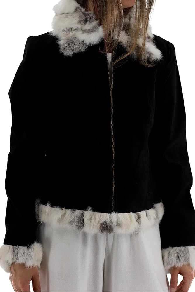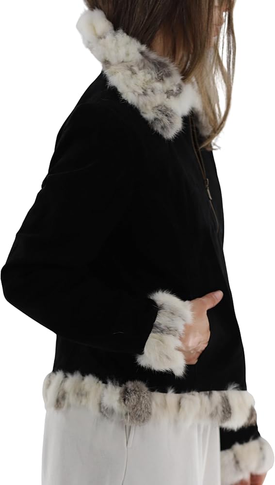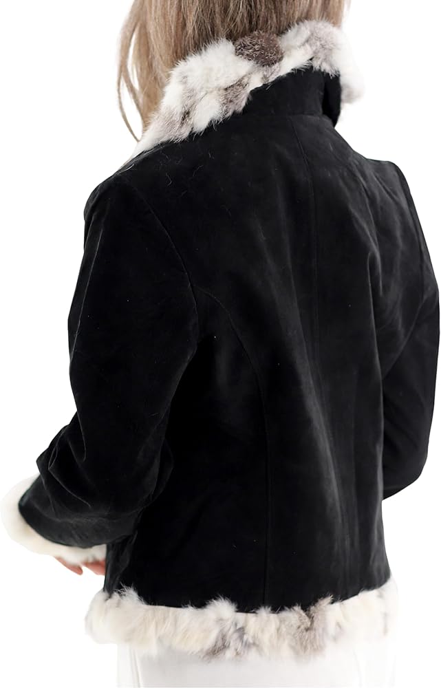 The combination of rabbit fur and suede leather creates a unique and opulent look, making a statement of refined luxury. The jacket typically features a tailored silhouette, with careful stitching and construction to ensure a flawless fit.