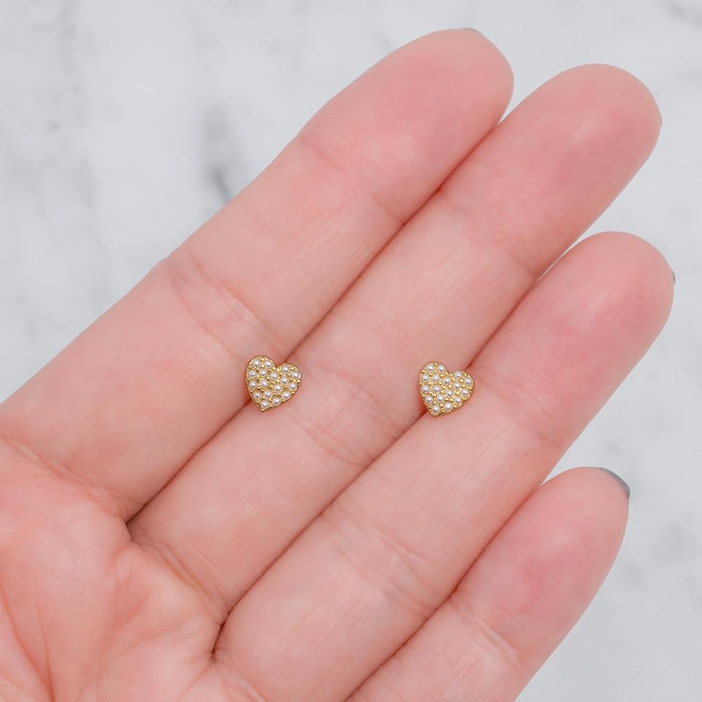 نحاس مطلي بالذهب عيار 14 قيراط مع لؤلؤ صناعي لزوج جميل من الأقراط رائع لأي مناسبة! يبلغ طول هذه الأقراط المرصعة باللؤلؤ والقلب 0.24 بوصة (6 مم) تقريبًا. يزن قرط واحد حوالي 0.29 جرام.