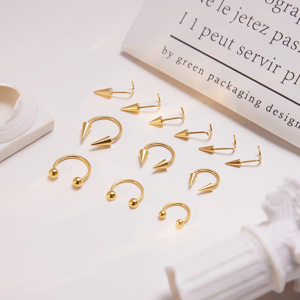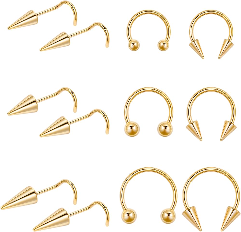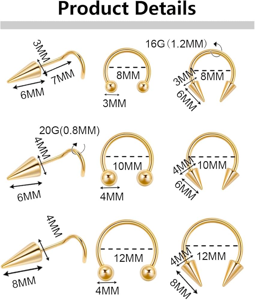 【الكمية والحجم】: يمكنك الحصول على 16 قطعة من حلقات الأنف الحاجزة في وقت واحد. تأتي حلقات الأنف هذه بثلاثة ألوان: الذهبي والفضي والأسود. يبلغ وزن مسمار الأنف 20 جرامًا، وأطواق الأنف ذات الحاجز 16 جرامًا. هناك نوعان من أشكال دبابيس الأنف: شكل L وشكل S.