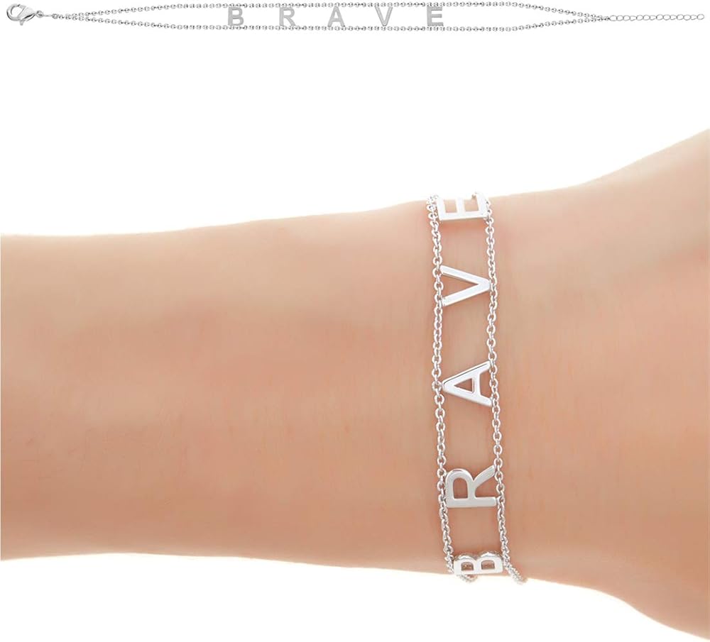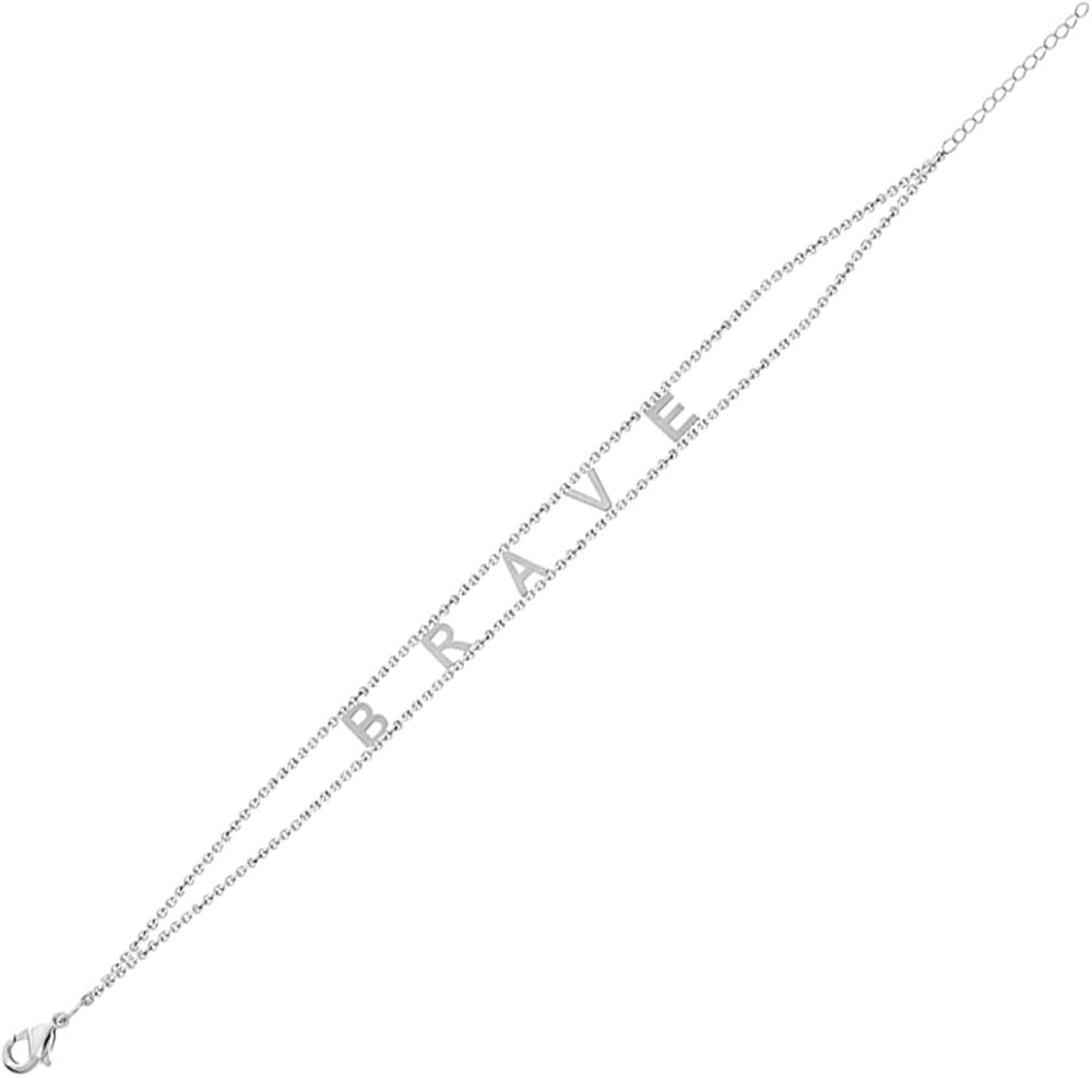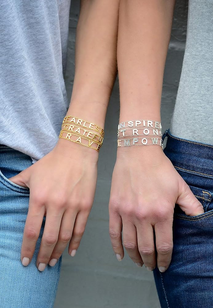 • (شجاع) أساور Maya J مصنوعة من النحاس بأحرف مقاس 1/4 بوصة × 1/4 بوصة ومطلية باللون الأبيض. يحتوي كل سوار على وصلة تمديد قابلة للتعديل مقاس 15.24 سم - 20.32 سم مع قفل مخلب سرطان البحر.