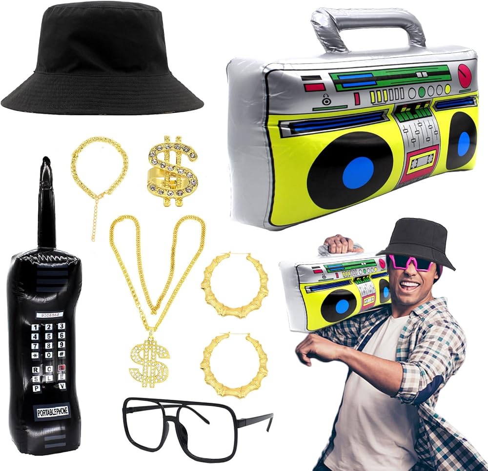 🔥【Super Value 9-Piece Set】Hip-hop costume props that you will personalize: 1 black bucket hat, 1 black frame glasses, 1 pendant gold necklace, 1 pair of gold earrings, 1 ring, 1 bracelet, 1 inflatable Speaker, 1 inflatable phone. Sufficient quantities can meet your various needs.