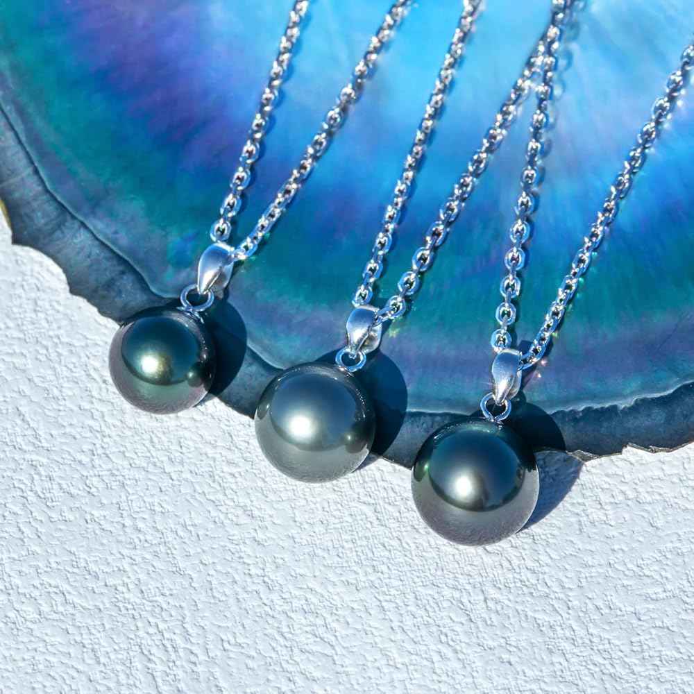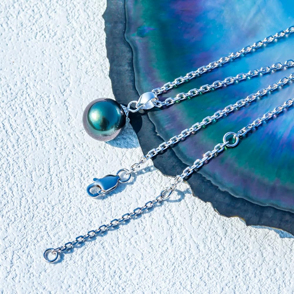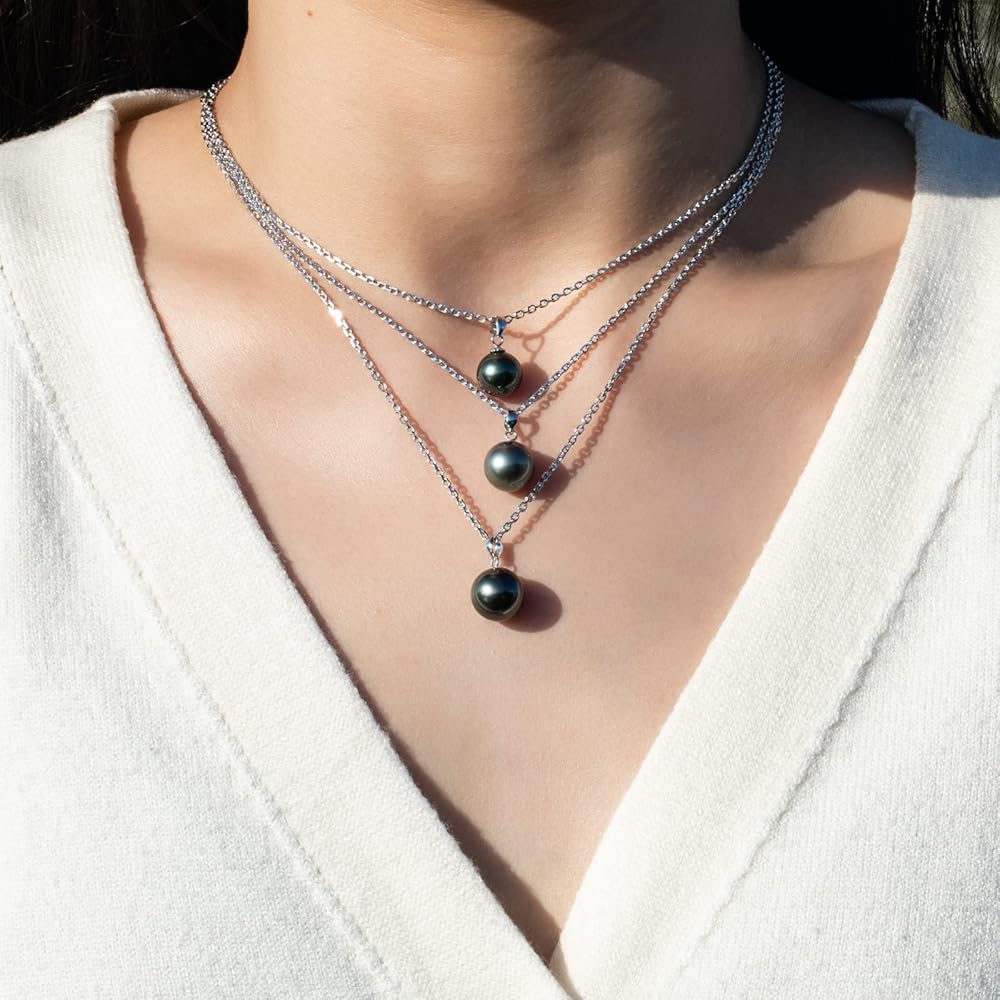 تتميز قلادة اللؤلؤة التاهيتية السوداء هذه بلؤلؤة تاهيتية سوداء مقاس 9-10 ملم، تم اختيارها يدويًا لبريقها المتألق وسطحها الدائري المثالي. تم تثبيت اللؤلؤة السوداء على أفضل قلادة من الذهب الأبيض عيار 18 قيراط، وأضافت إليها سلسلة مطابقة من الفضة الإسترليني المطلية بالذهب الأبيض عيار 18 قيراط. يمكن أن تكون أنيقة أو غير رسمية، مناسبة للسجاد الأحمر أو للشاطئ.
