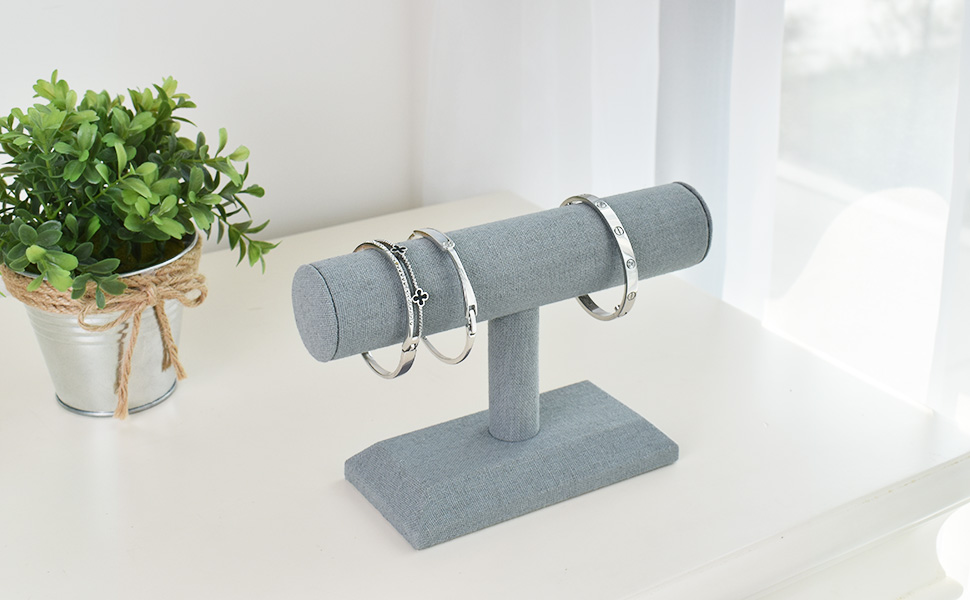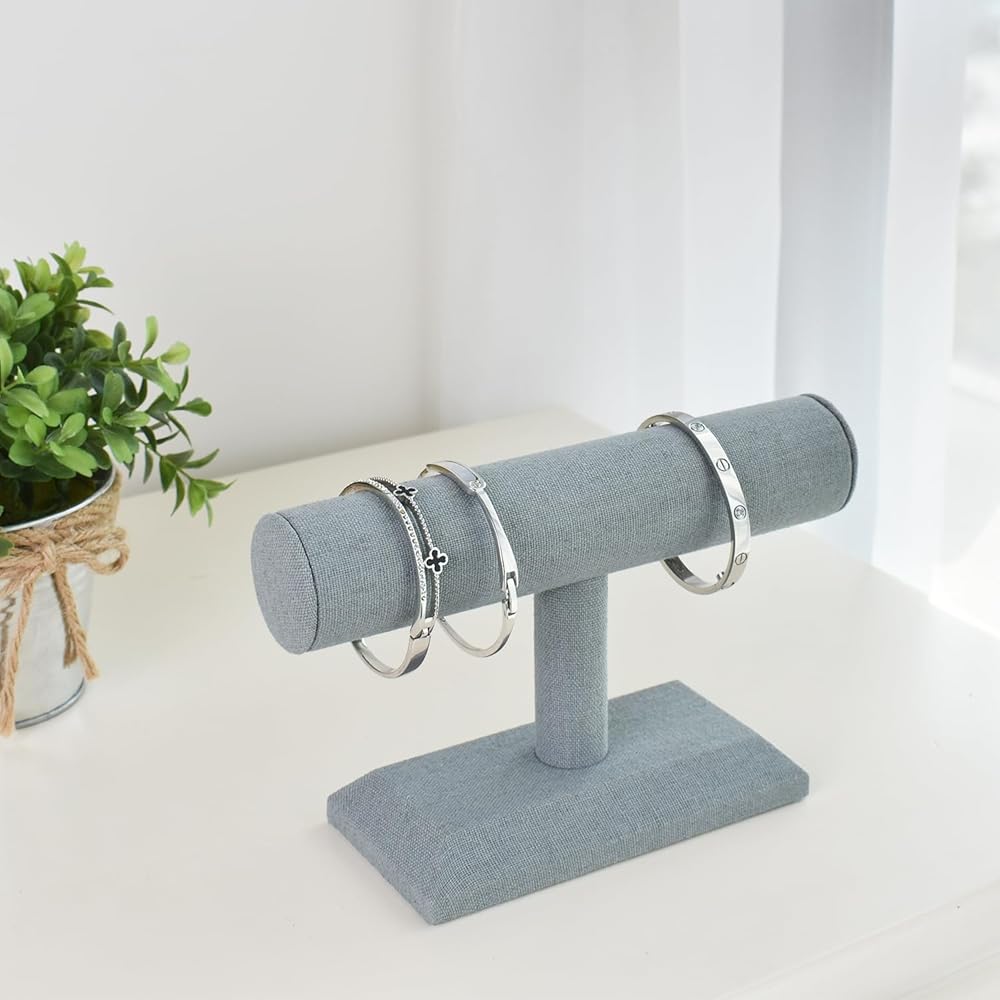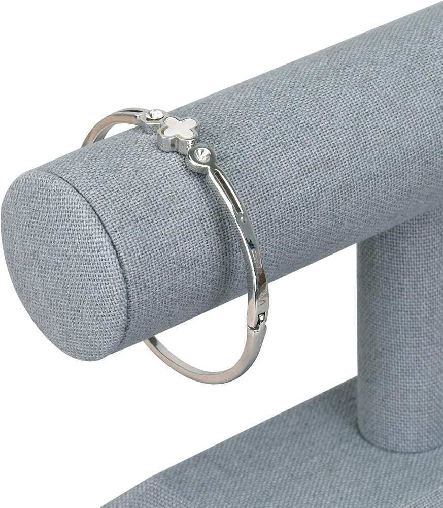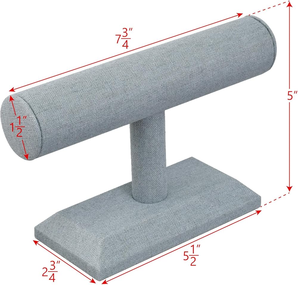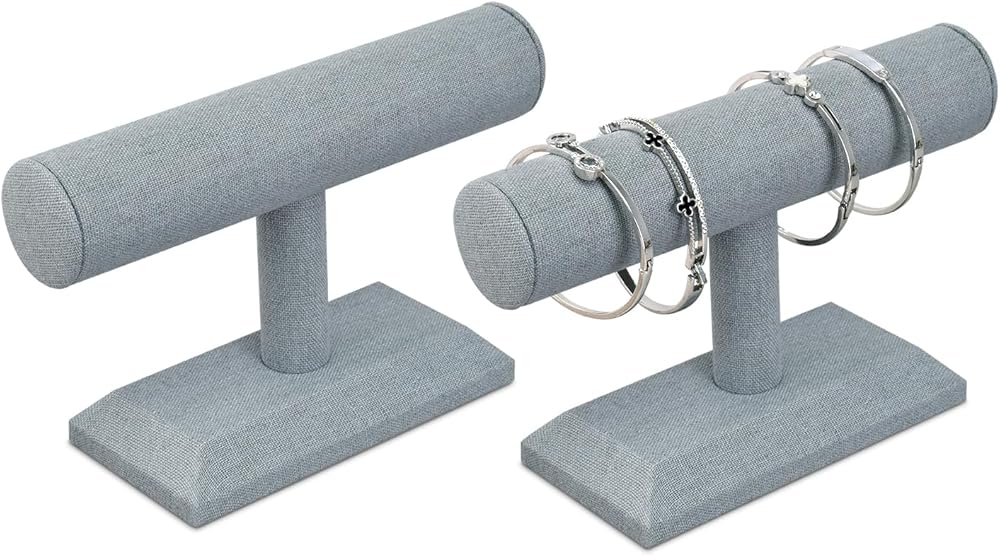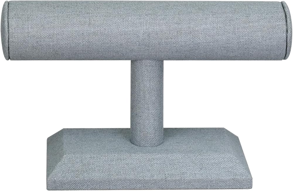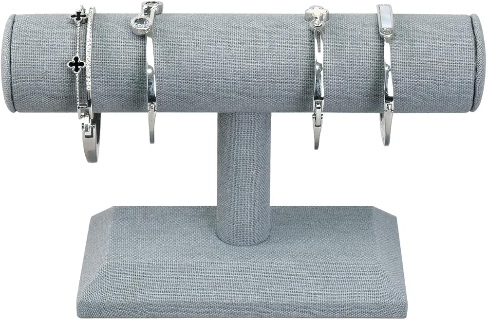 ايكي ديزاين مجموعة من قطعتين حامل اساور خشبي مغطى بالكتان لعرض المجوهرات والساعات والاساور والمجوهرات والاساور الحلقية وحامل الاساور الحلقية على شكل حرف T لتنظيم المنزل، رمادي داكن