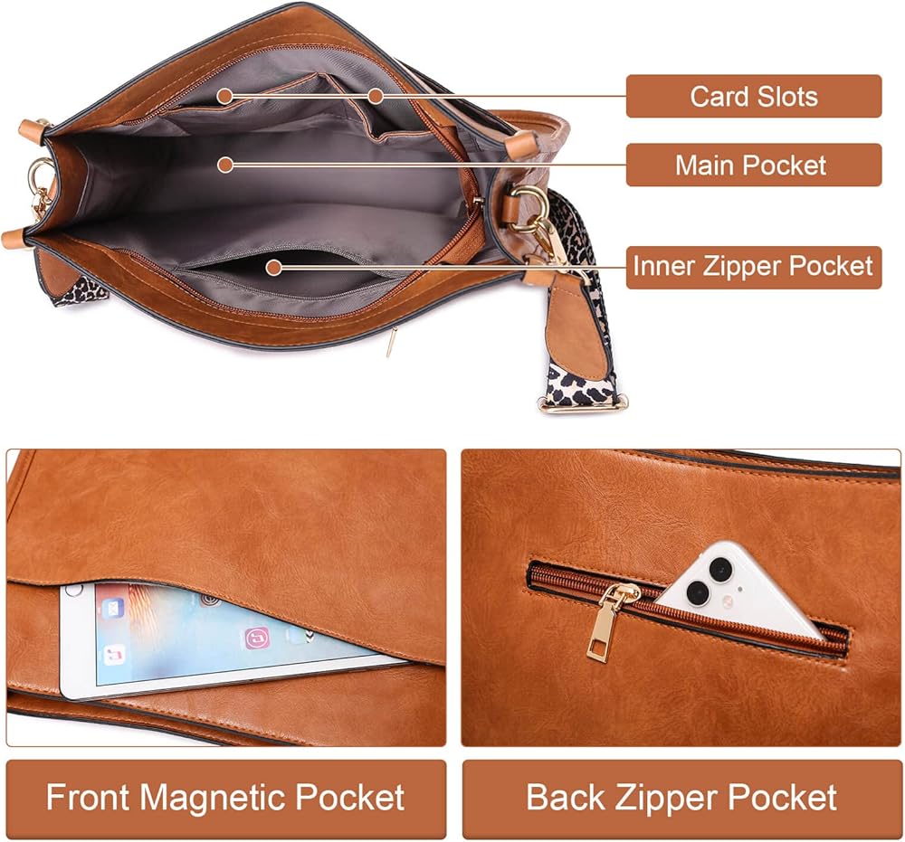 الحجم والتخزين: بأبعاد 11.8 بوصة و10.6 بوصة و3.9 بوصة (طول عرضي)، توفر حقائب الجسم الكبيرة مساحة واسعة لممتلكاتك. يحتوي الجزء الداخلي على جيب رئيسي بسحاب، وجيب داخلي بسحاب، وفتحتين للبطاقات. يوجد في الخارج جيب مغناطيسي أمامي وجيب خلفي بسحاب. يمكنه بسهولة حمل هاتفك ومحفظتك ودفتر الملاحظات وأحمر الشفاه والمفاتيح والمزيد، مما يلبي احتياجاتك اليومية.