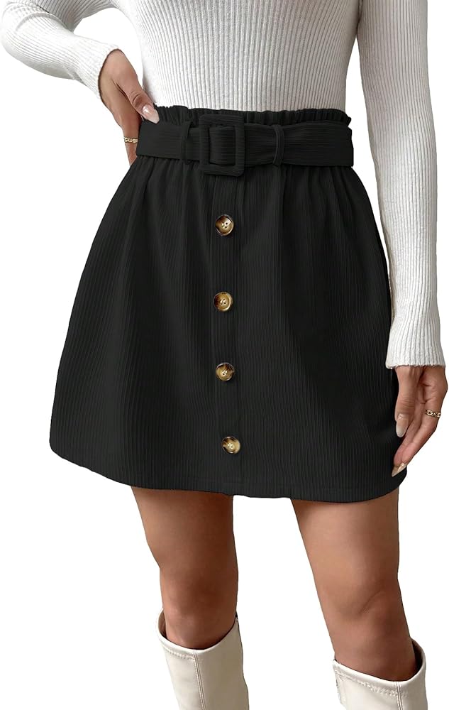 - Features: Corduroy, high waist, belted, paperbag, button, a line, mini skirt