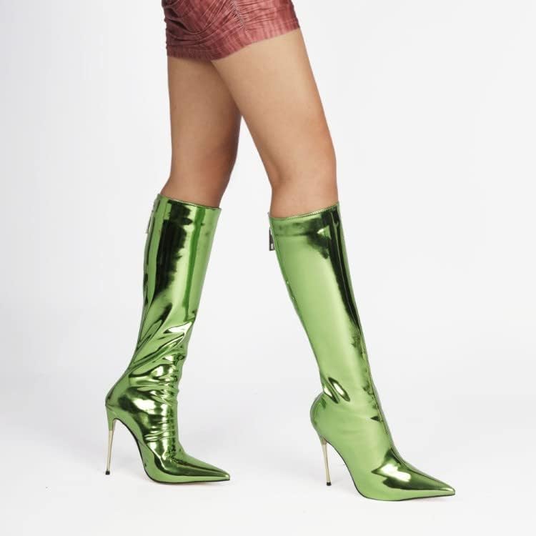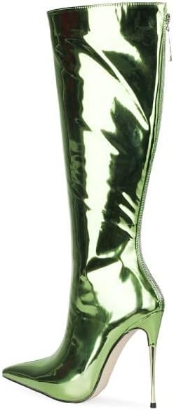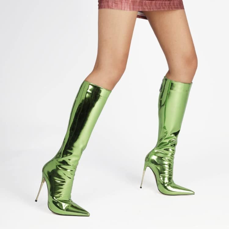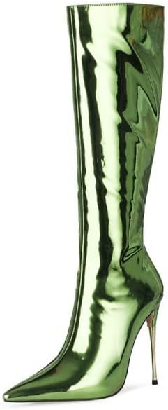 - أحذية طويلة حتى الركبة معدنية أنيقة مصممة من مادة معدنية لامعة، وكعب ستيليتو، وتصميم مثير مدبب عند الأصابع
