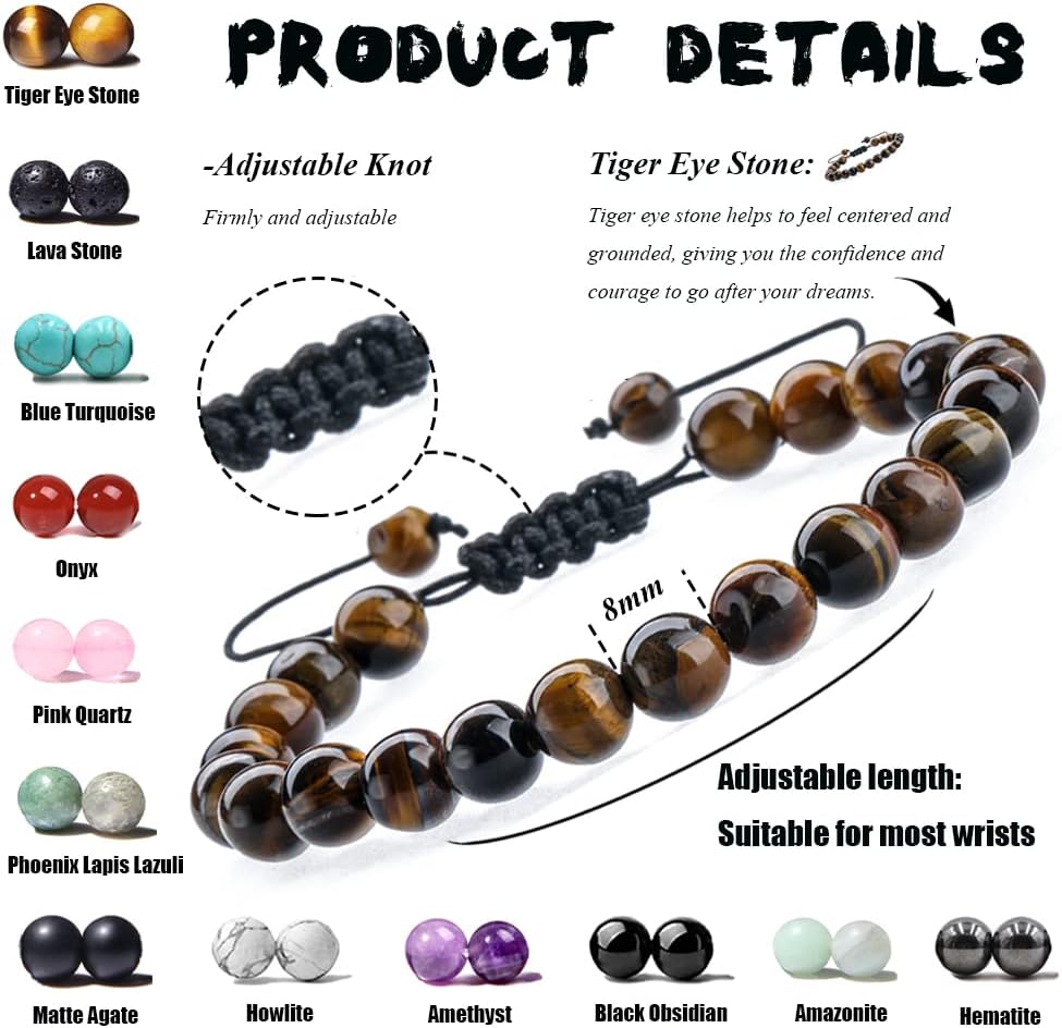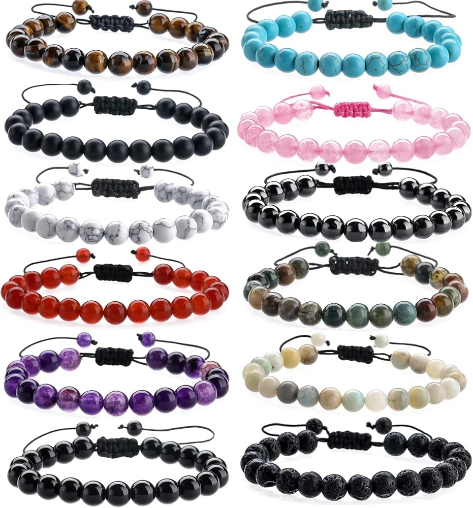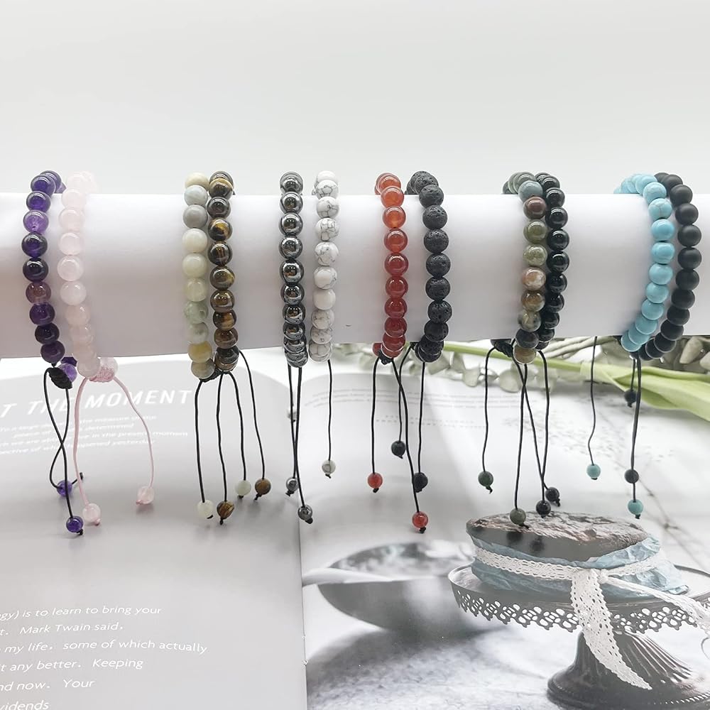 【مجموعة أساور قابلة للتعديل】تحتوي العبوة على 12 قطعة من الأساور الحجرية القابلة للتعديل مع خرزات عالية الجودة مقاس 8 مم، والعقدة القابلة للتعديل تجعل من السهل ارتداؤها وخلعها، وتناسب معظم أحجام المعصم. الأساور ذات تصميم كلاسيكي بسيط ومريح، وأنيقة تستخدم سلكًا أقوى.