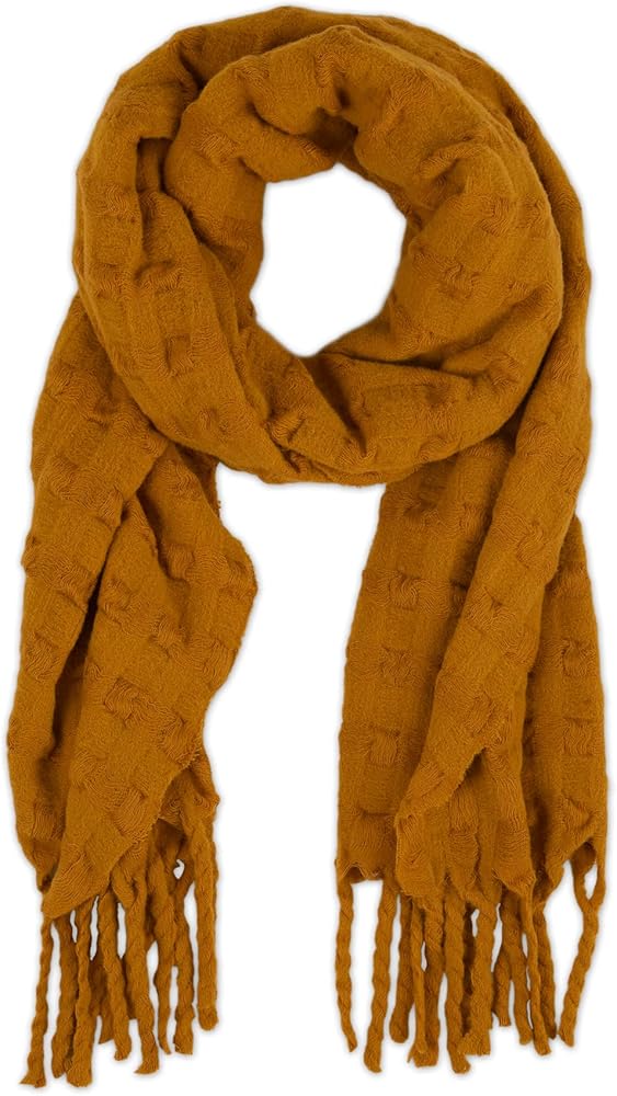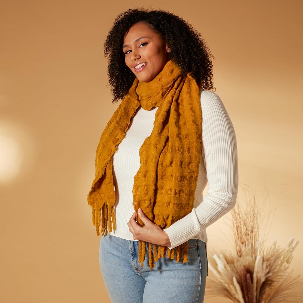 SIZE AND MATERIAL: This textured, cozy, medium-weight scarf is made from soft polyester/viscose blend of fiber and measures 71x27 inches