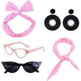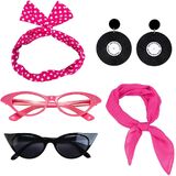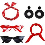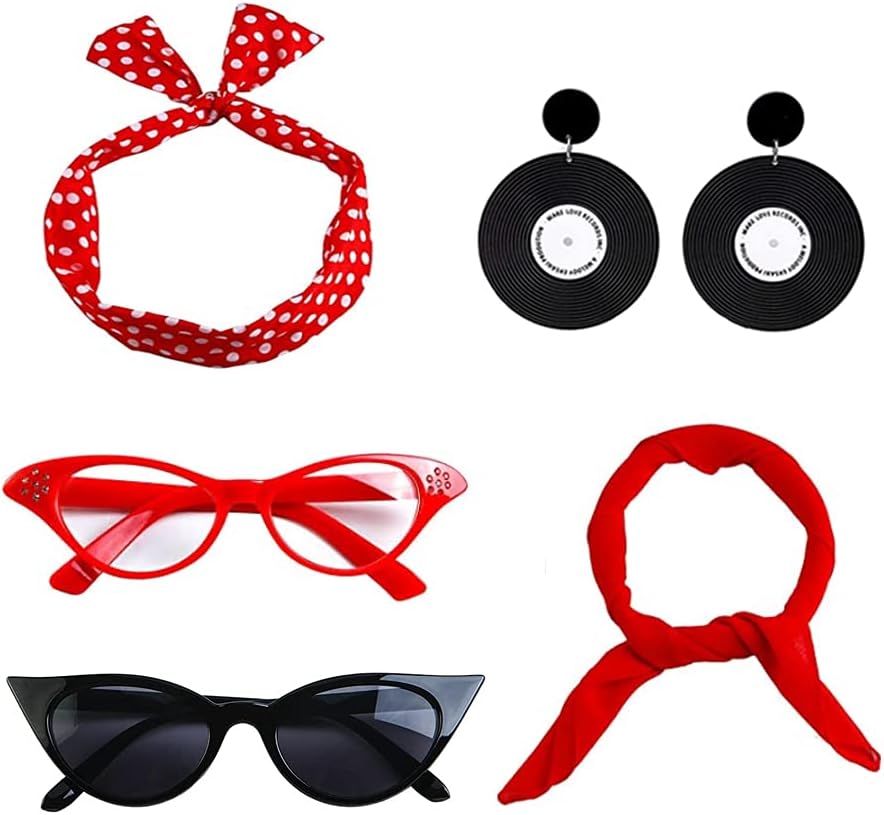 • Packing list: 1 tulle chiffon scarf, 1 pair of retro record earrings, 1 pair of cat glasses, 1 pair of small black frame glasses, 1 polka dot headband, these five-piece sets will let you find fun in the 50s party.