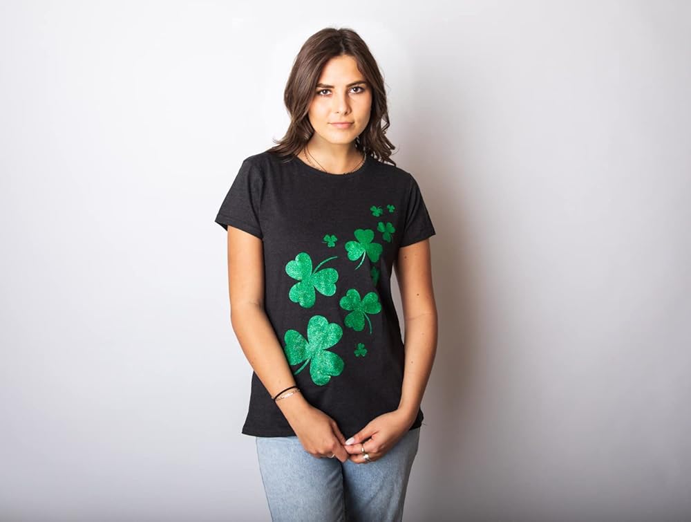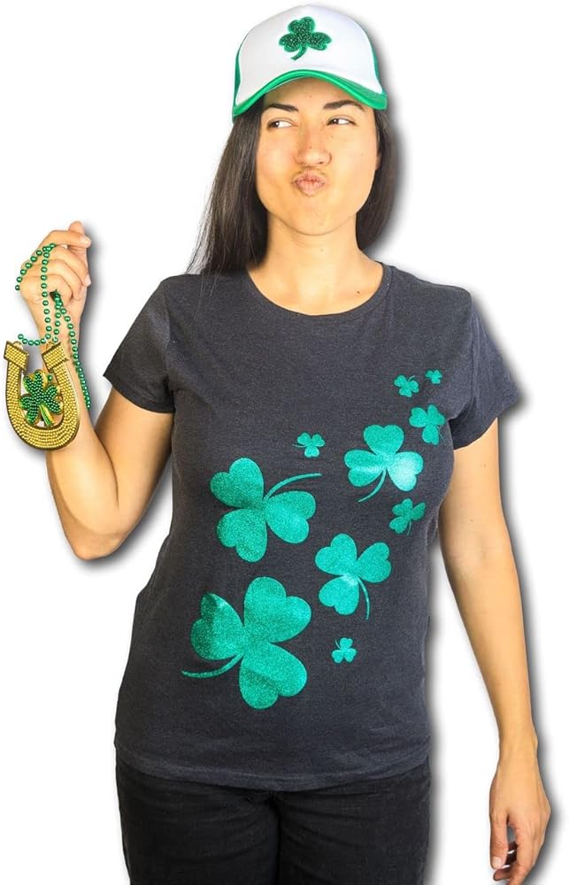 تي شيرت نسائي لامع شامروك مضحك سانت باتريك يوم شامروك البرسيم