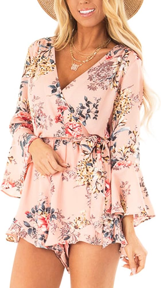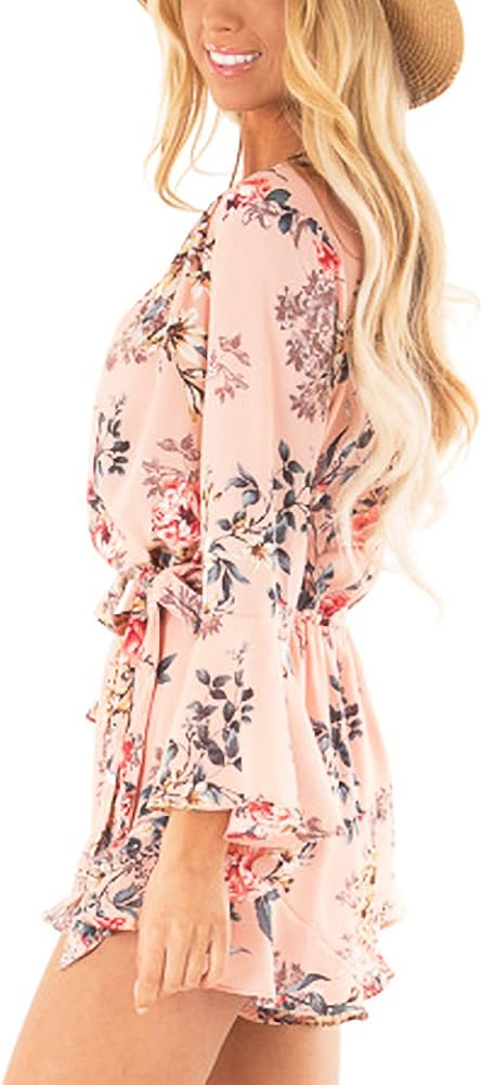 Features: Floral print summer casual romper/Ruffle hem summer rompers jumpsuits/V neck romper for women/Waist tie knot womens romper/Flowy summer rompers/Above knee length jumpsuit/Pull on romper/Women's flowy summer romper jumpsuit.