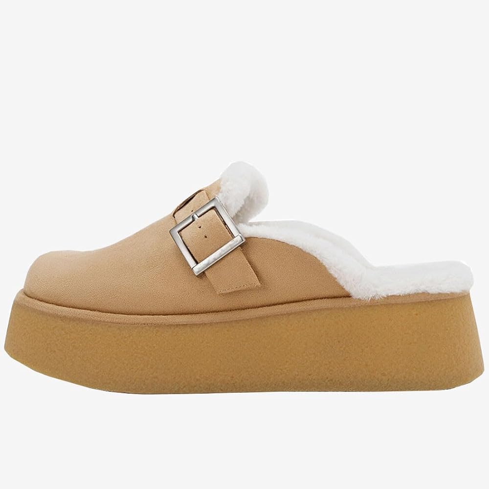 STYLISH & COZY : Platform mules feature a breathable suede upper and a classic round-toe silhouette, and a faux wool lining provides a fluffy cozy feeling, ensuring warmth and comfort all day long.