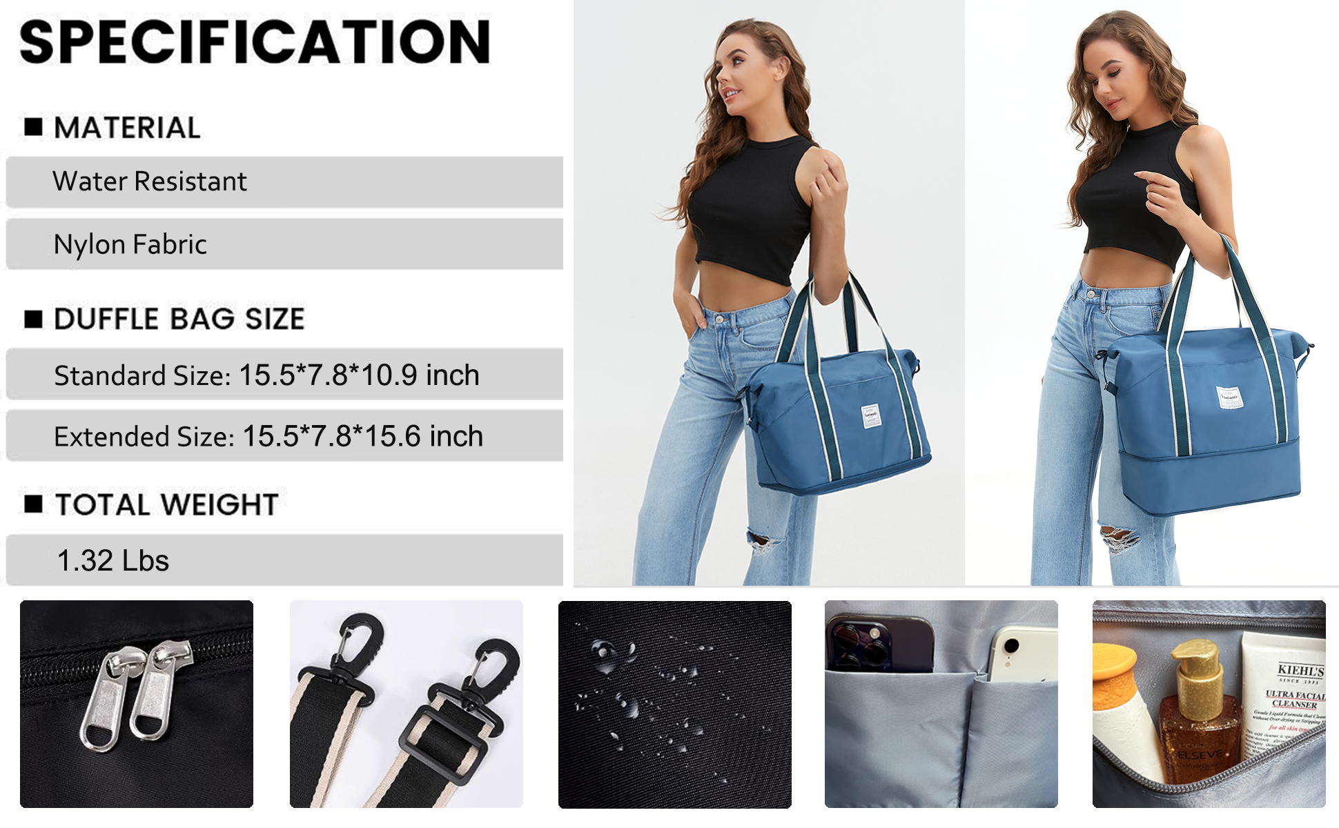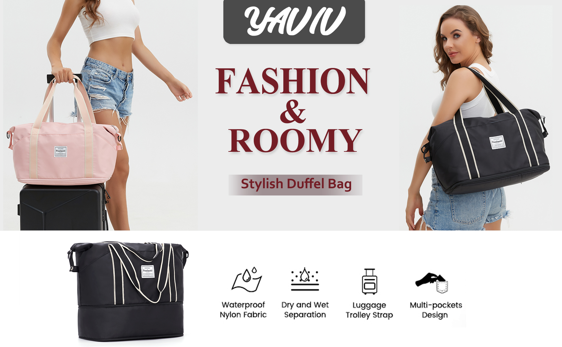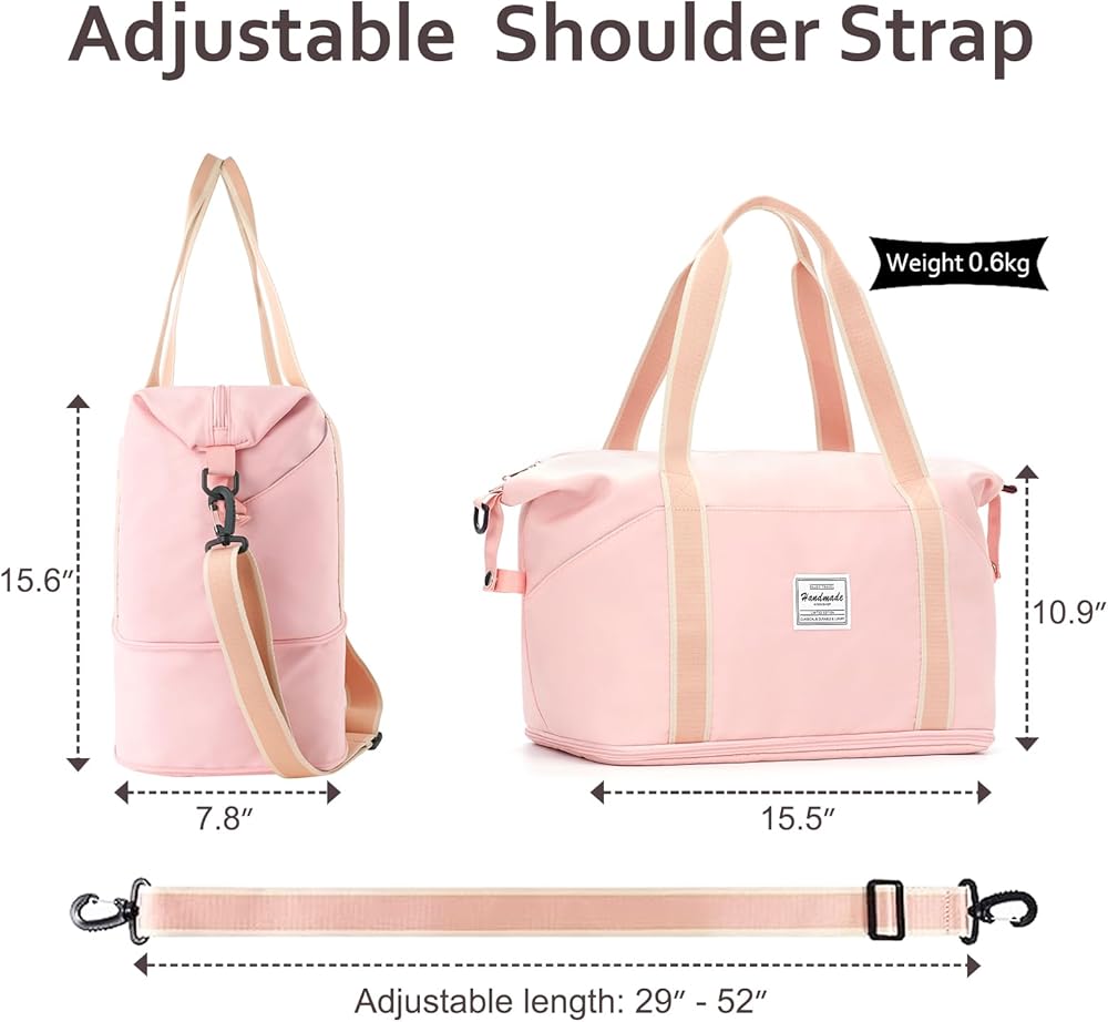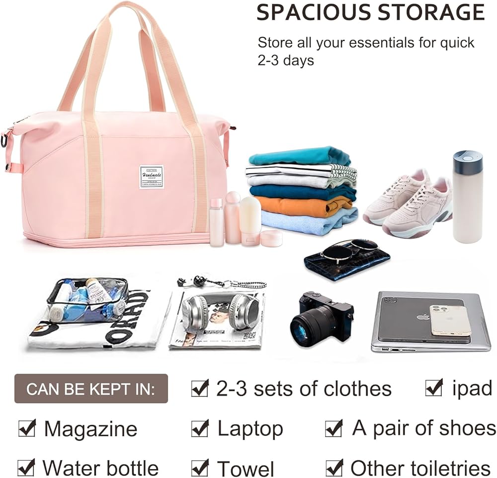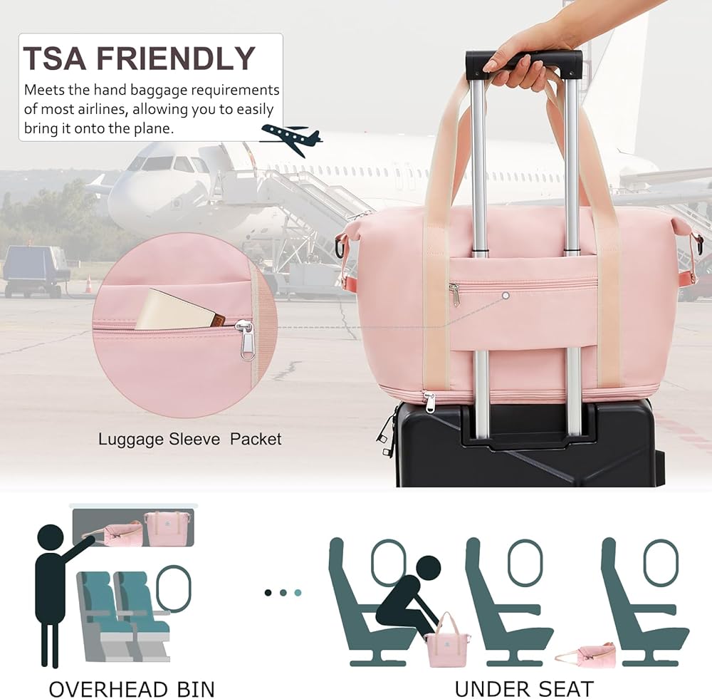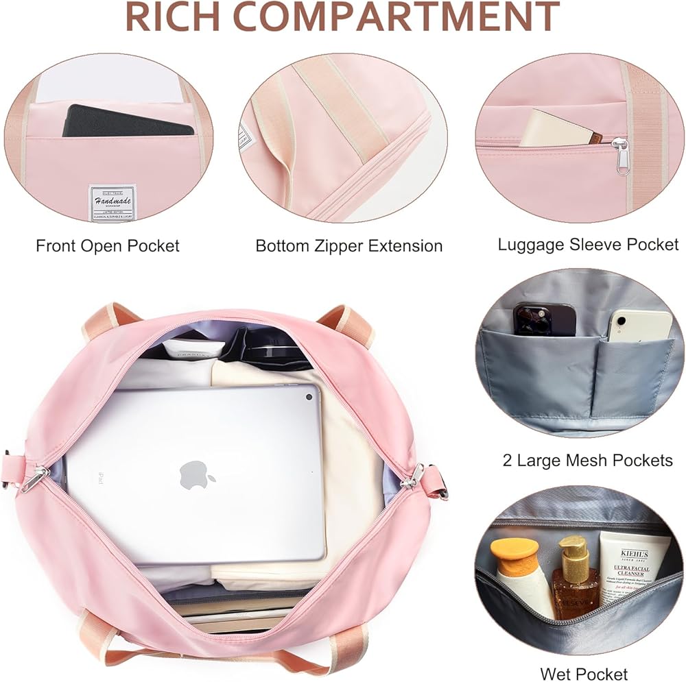 حافظ على العناصر نظيفة وأنيقة ومنظمة - إلى جانب الكثير من الجيوب لأشياء السفر الصغيرة مثل بطاقة الهوية أو جواز السفر أو بطاقة الصعود إلى الطائرة، تحتوي حقيبة عطلة نهاية الأسبوع هذه أيضًا على جيب منفصل من مادة PVC المقاوم للماء لتخزين الملابس المبللة أو المناشف أو ملابس السباحة.