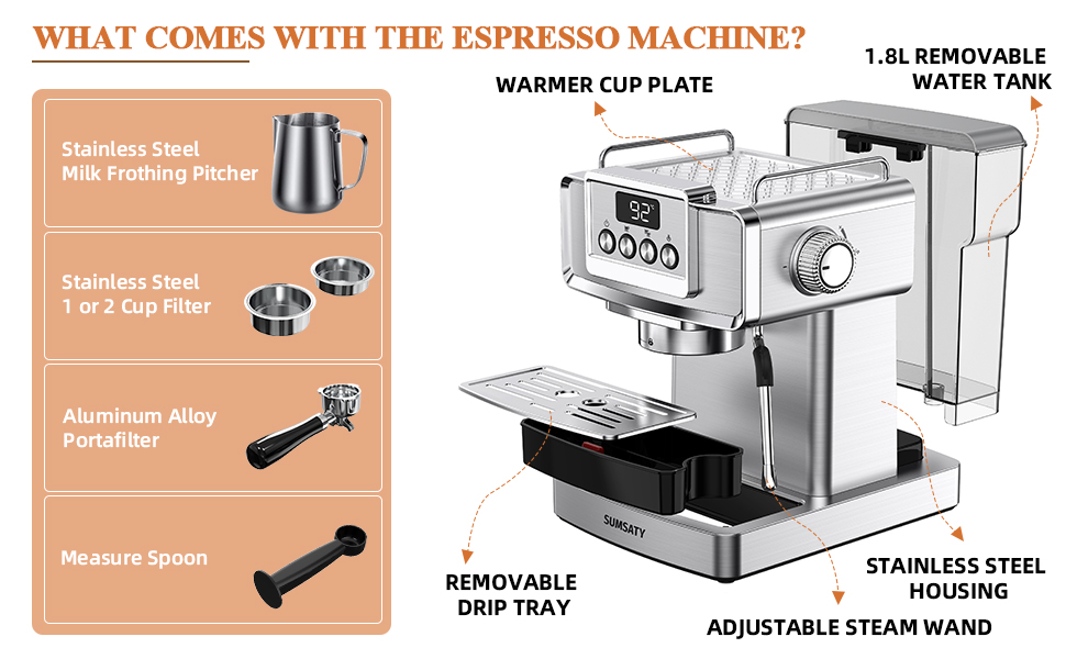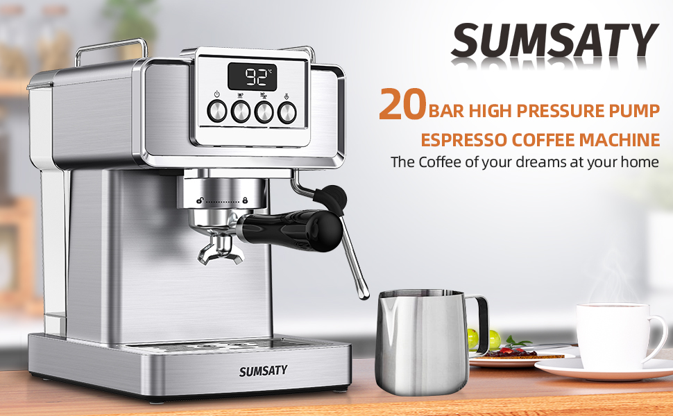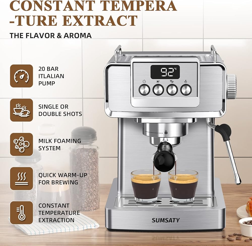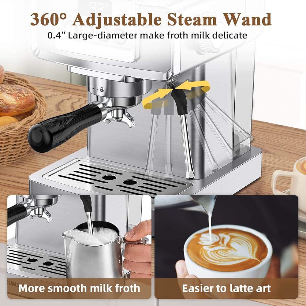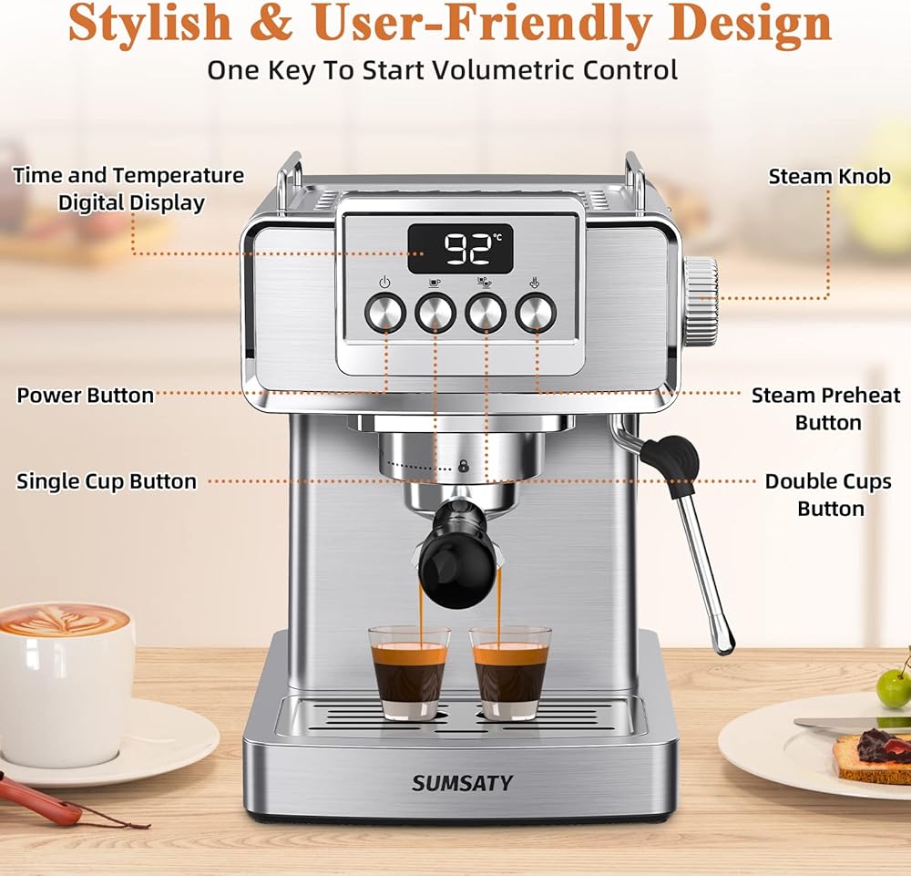تصميم متين وعصري - ماكينة صنع قهوة الإسبريسو SUMASTY بمظهر من الفولاذ المقاوم للصدأ مصنوعة من مواد عالية الجودة مصممة لتدوم طويلاً. يمنحه الجزء الخارجي المصنوع من الفولاذ المقاوم للصدأ مظهرًا أنيقًا وعصريًا يكمل أي ديكور للمطبخ.