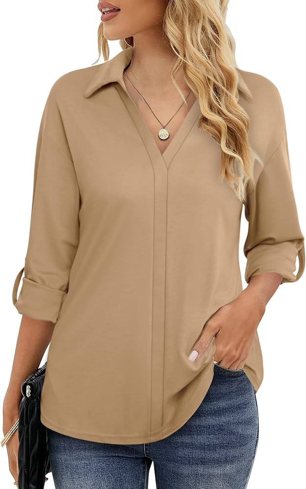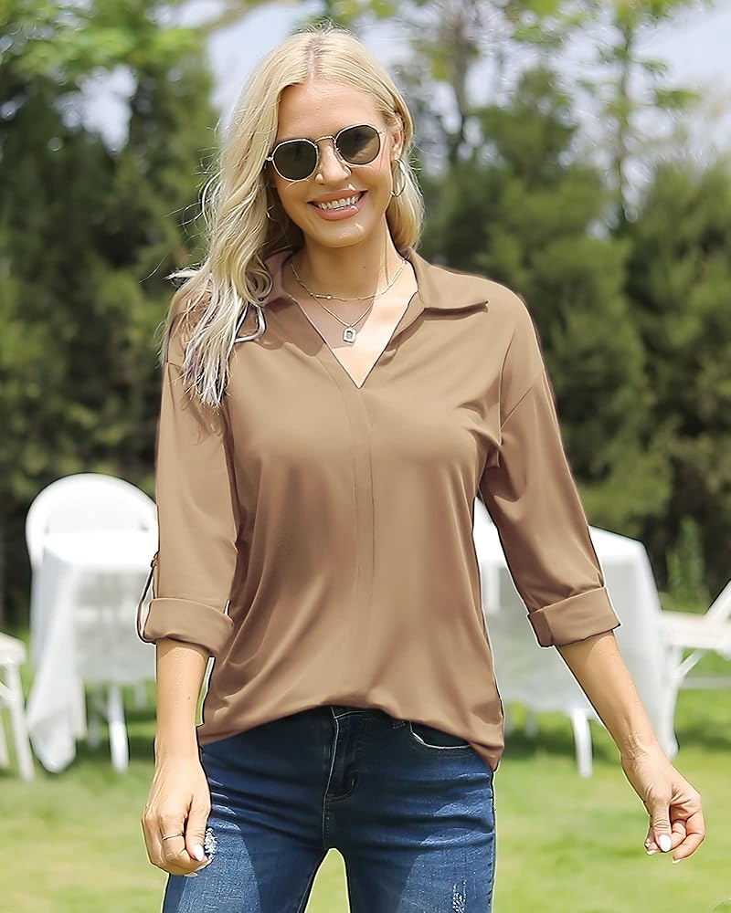 ✅ ميزات الموضة - بلوزات 3/4 كم للنساء/ قمصان بياقة للسيدات/ قمصان رسمية لطيفة/ قميص بأكمام بأساور/ قمصان قطنية برقبة على شكل حرف V لباس مكتب/ تونيك عمل للخريف/ بلوزات كاجوال للعمل