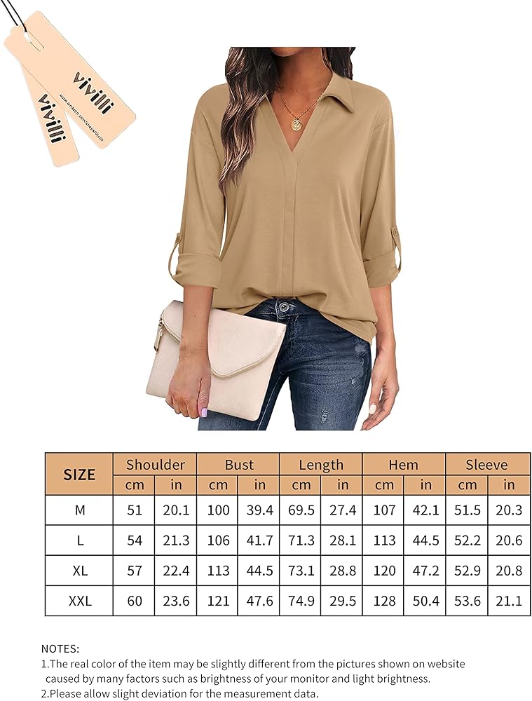 ✅ تصميم عصري بياقة على شكل حرف V - قمصان وبلوزات بأكمام 3/4 برقبة على شكل حرف V مع ياقة تعدل خط رقبتك بشكل أكثر أناقة. تصميم كتف منسدل فضفاض قليلاً يناسب أي نوع من أنواع الجسم. طول القمصان المثالي يغطي منتصف الوركين بشكل طبيعي.