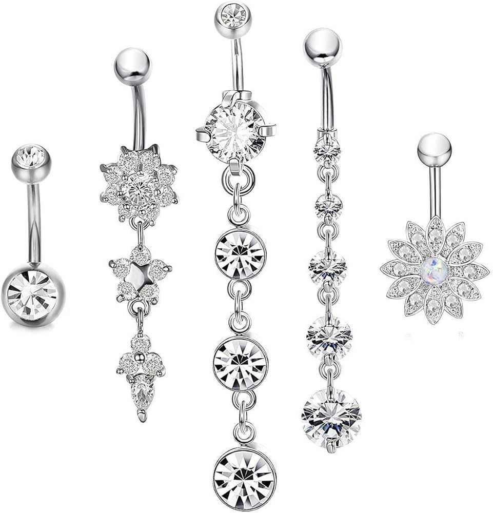 CrazyPiercing Dangle Belly Button Rings Surgical Stainless Steel for Women Girls 5 PCS Set (Silver)