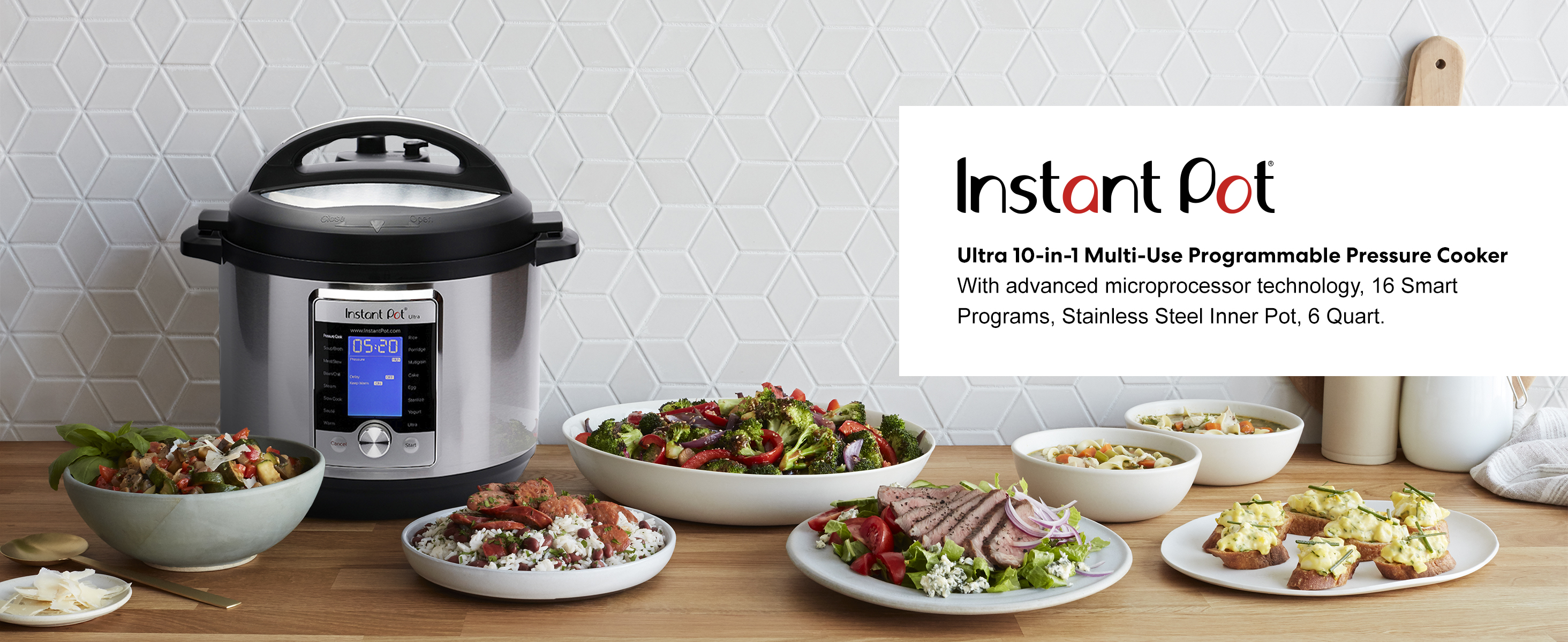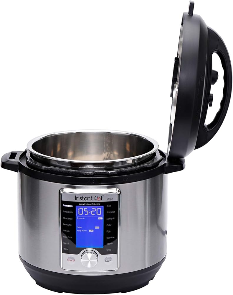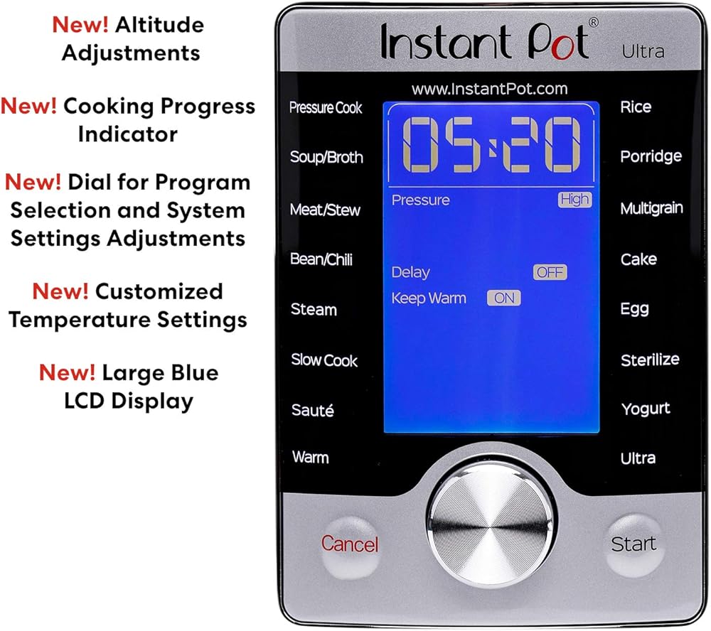 Instant Pot Ultra 10 In 1 Multi-Use Programmable Cooker is the next generation in kitchen appliances. Designed for the home chef looking for a greater degree of customization and control for even greater precision cooking. The Ultra combines the functions of a Pressure Cooker, Slow Cooker, Rice/Porridge Cooker, Cake Maker, Yogurt Maker, Saute/Searing, Steamer, Warmer, Sterilizer, and, a truly new and unique feature, the ultra-program. The 'Ultra' provides complete custom programming for pressure and non-pressure cooking. Now, one can set the exact parameters desired to achieve perfect results each and every time. With the 'Altitude' adjustment, the guesswork is eliminated from a recipe conversion providing a more precise cooking time. Designed with a large, blue LCD display with a 'Cooking Indicator' to provide one a clear visual on the progress of your dish from preheating, cooking, and Keep Warm. A central dial with a simple turn and press provides added precision in program selection and adjustments. And, the new - 'Steam Release Reset Button' ensures the safer handling of the steam release after cooking is completed. Built with 16 smart programs: Soup/Broth, Meat/Stew, Bean/Chili, Cake, Egg, Slow Cook, Saute/Searing, Rice, Multigrain, Porridge, Steam, Sterilize, Yogurt, Warm, Pressure Cook, and Ultra. Now, your favorite dishes are as simple as selecting your preferences and having them ready up to 70% faster. With the 'Sterilize' program one can pasteurize dairy products, sterilize baby bottles, jars, and utensils; As well as, perform certain types of canning much more conveniently than ever before The 'Cake Maker' is designed to prepare soft and moist cakes and the 'Egg' prepares perfect eggs in just a few minutes. America's most trusted brand has moved into a category of its own with the Instant Pot Ultra Delay Start time - Up to 24 hours.