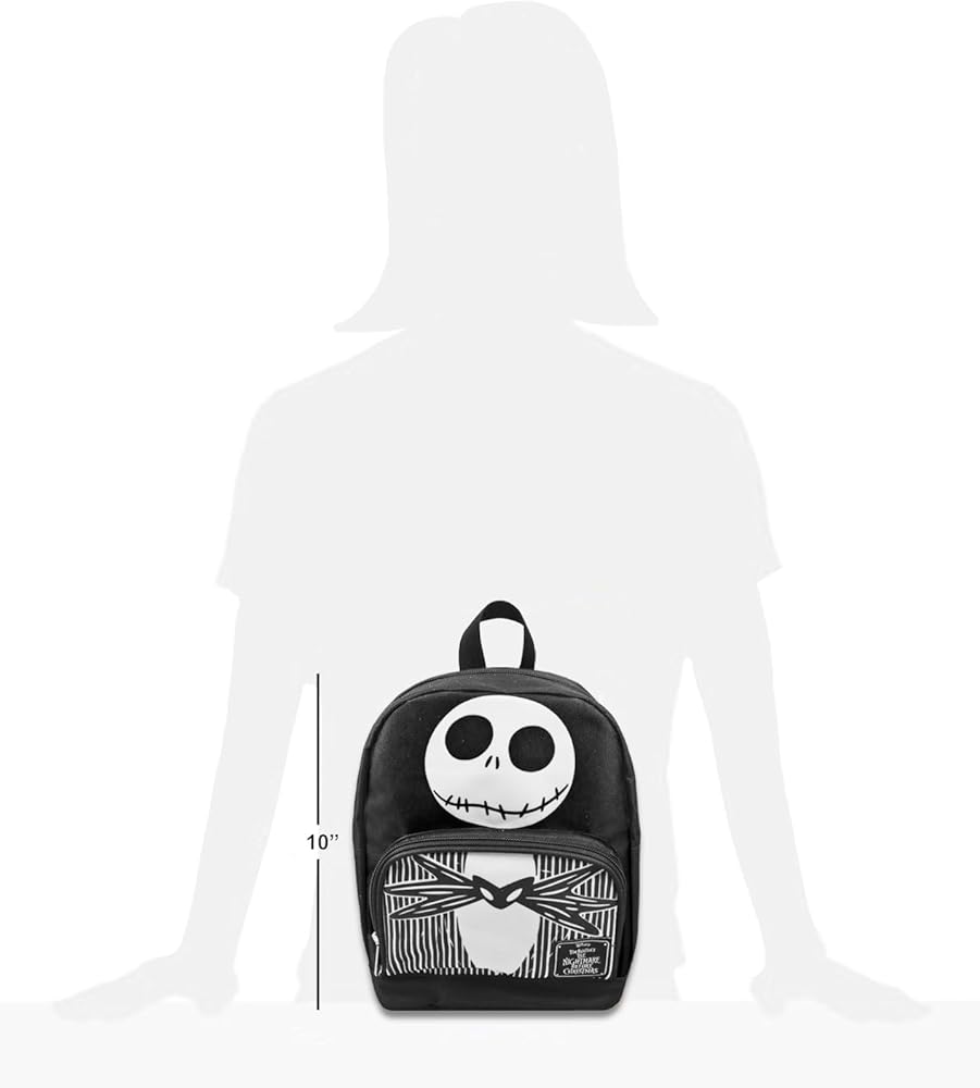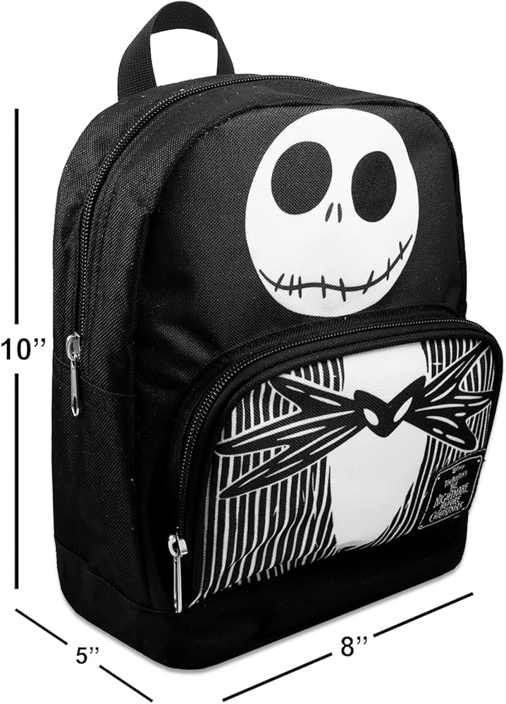 Crenstone Exclusive Nightmare Before Christmas Mini Backpack - Bundle with 10” Jack Skellington Backpack with Front Pocket Plus Beach Kids Water Bottle | Jack Skellington Backpack Purse. This Nightmare Before Christmas backpack set includes a 10” backpack with adjustable shoulder straps, zip closure compartments, front pocket, and top loop for hanging featuring iconic artwork of Jack Skellington. This Jack Skellington backpack for kids and adults contains plenty of room to carry your wallet, phone, and any other small items you need to take to school or on the go. Show off your love of Jack Skellington in style. This Nightmare Before Christmas backpack bundle also includes a Beach Kids water bottle, making the perfect gift set for any Nightmare Before Christmas fan. Officially licensed Nightmare Before Christmas Jack Skellington backpack set is perfect for fans of all ages, boys and girls, teens and adults alike.