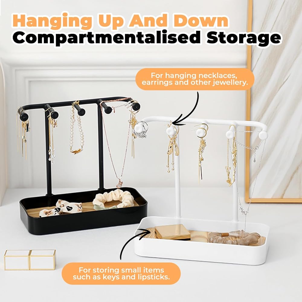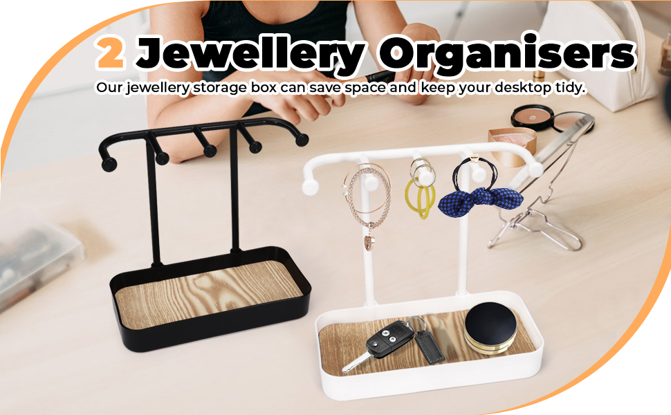 【حامل قلادة من طبقتين】 ستحصل على مجموعتين من حامل القلادة. يتميز كل منظم بـ 5 خطافات لتعليق القلائد والأقراط، وصينية مستطيلة لتخزين الأشياء الصغيرة مثل المفاتيح وأحمر الشفاه.