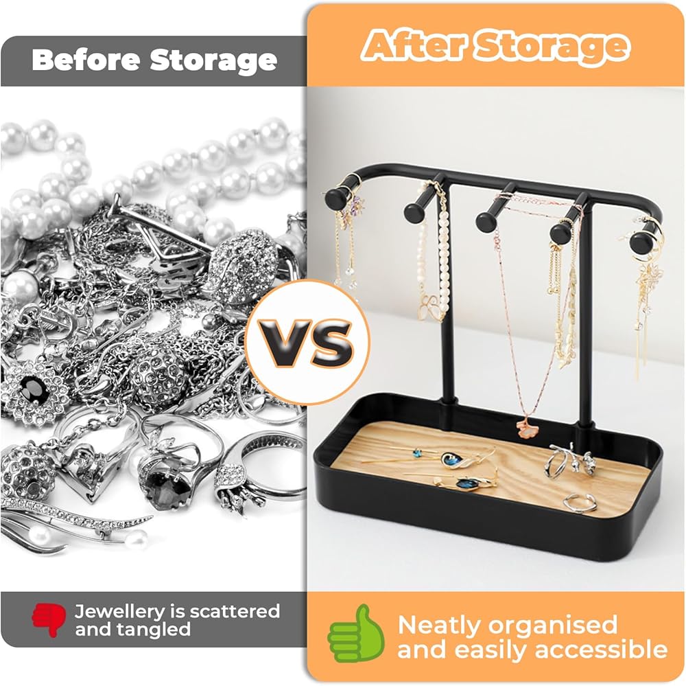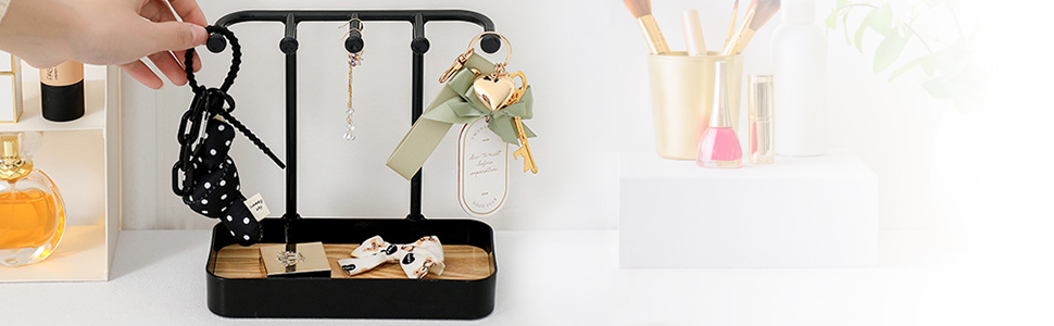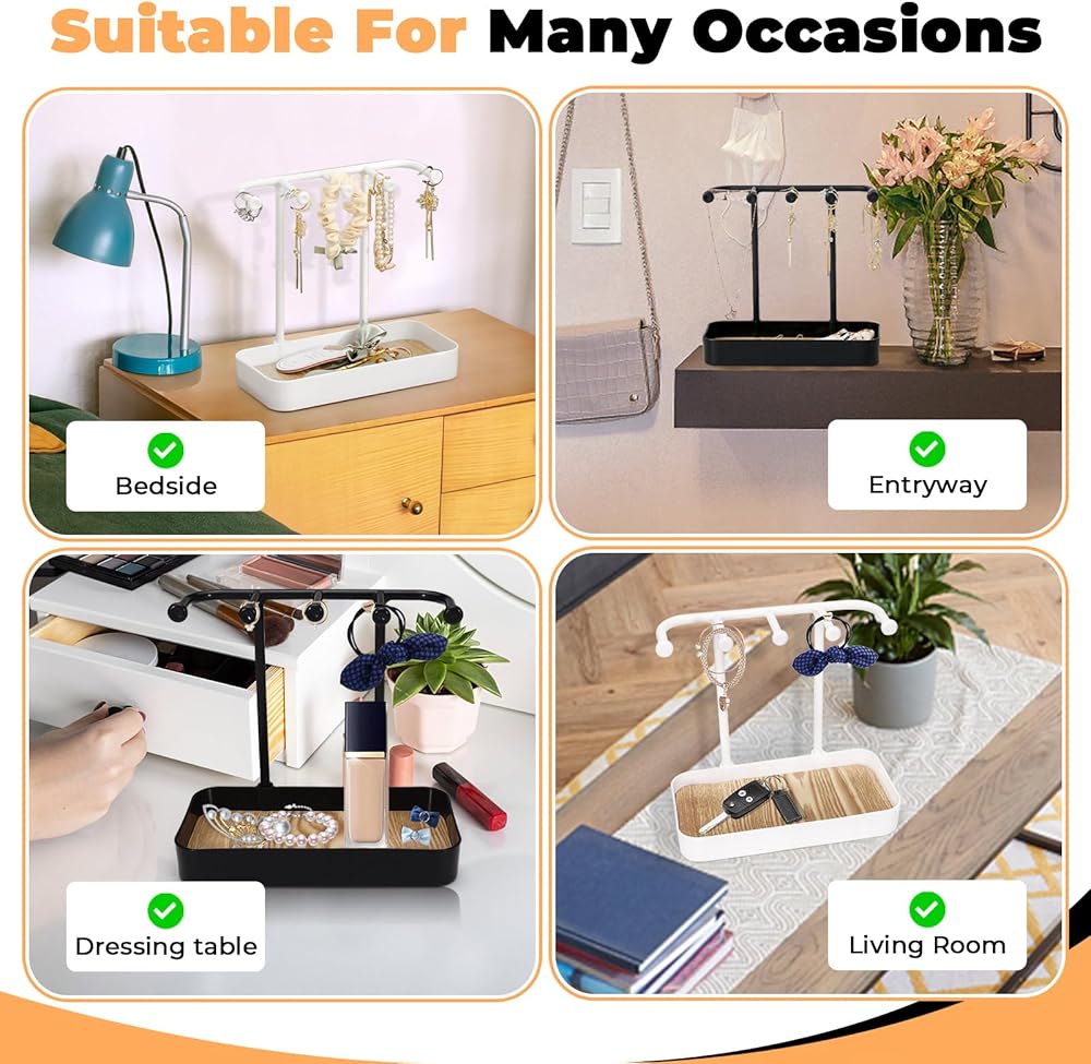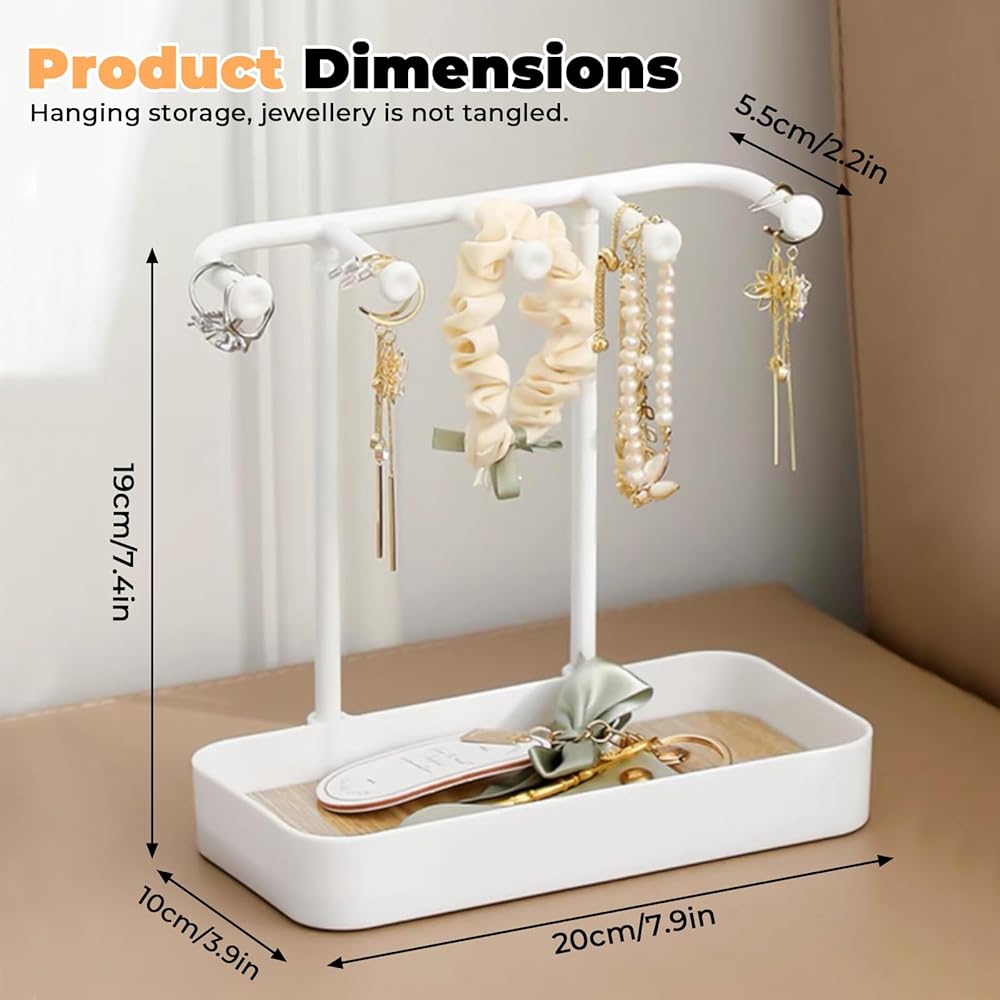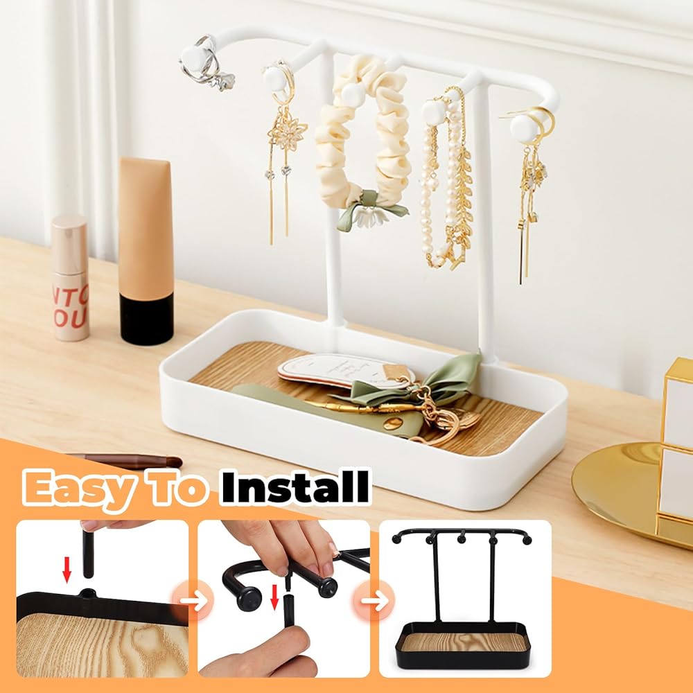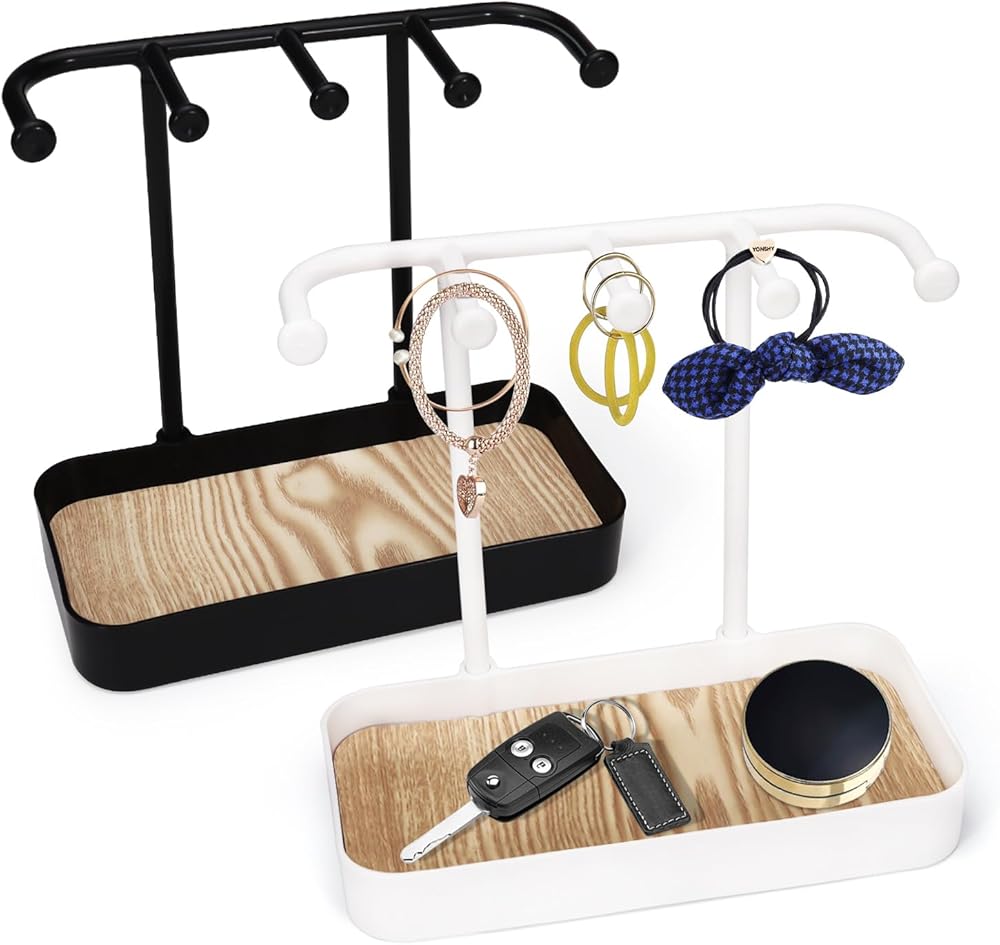 منظم حامل مجوهرات مكون من قطعتين من بيليفو مع 5 خطافات وصينية خشبية، حامل قلادة وحلقان صغير، رف مجوهرات على شكل شجرة للمجوهرات، حامل شماعات عرض للاساور والخواتم وخزانة الملابس وسلسلة المفاتيح