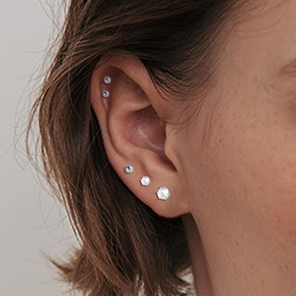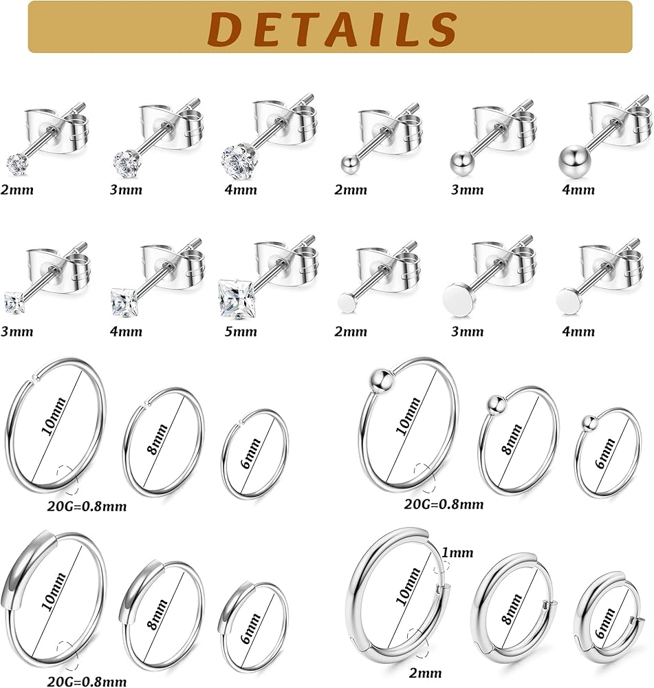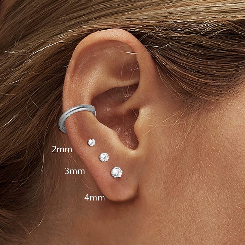 👧[حجم الأقراط]: قطر الزر الدائري/الكرة/النقطة: 2 مم 3 مم 4 مم؛ المربع تشيكوسلوفاكيا: 3 مم 4 مم 5 مم. سمك الشريط: 20 جم (0.8 مم). القطر الداخلي: 6 مللي متر 8 مللي متر 10 مللي متر.