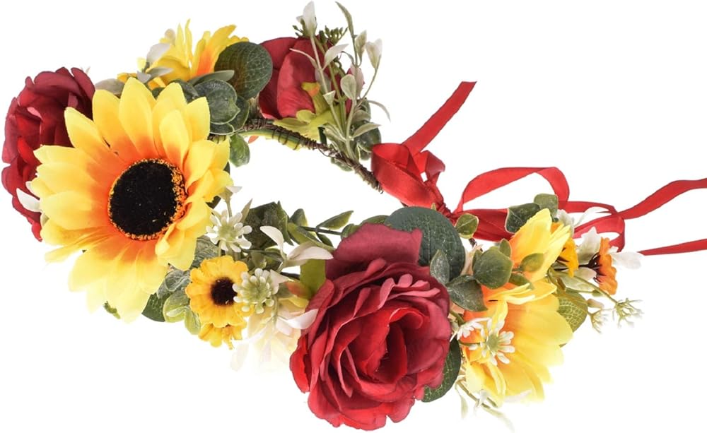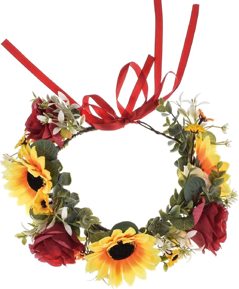 عصابة رأس لحفلات الزفاف على شكل تاج ودوار الشمس وتاج زهرة الأوكالبتوس من فيفدسون (زهرة الكينا الحمراء الصفراء والكاحل)