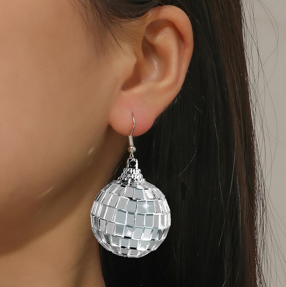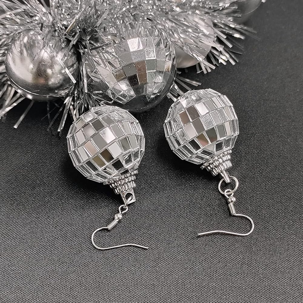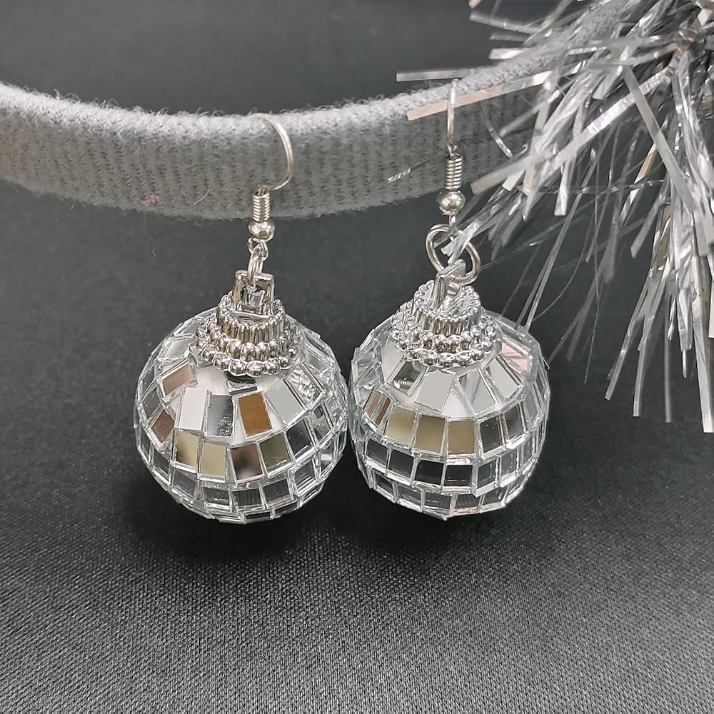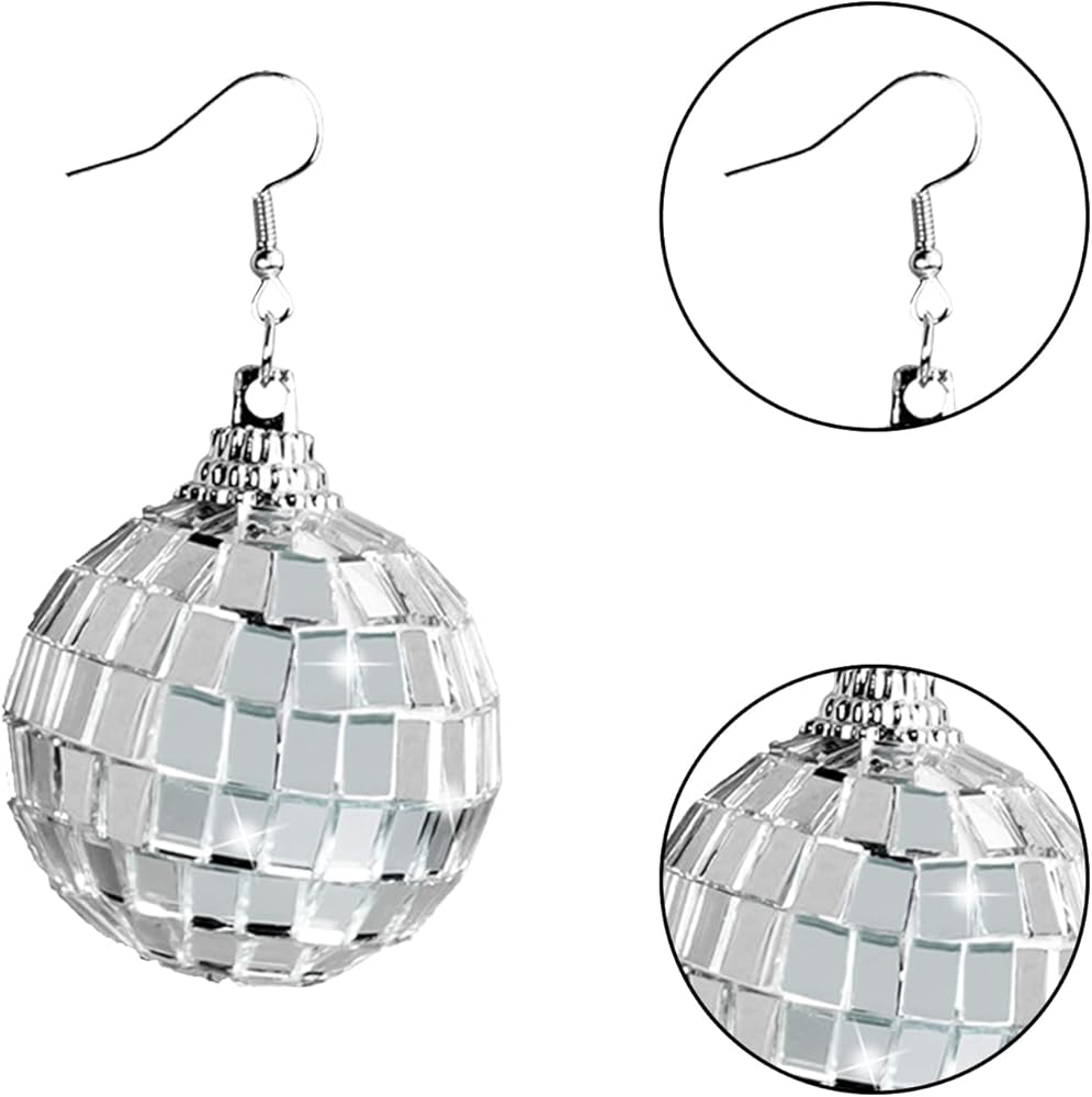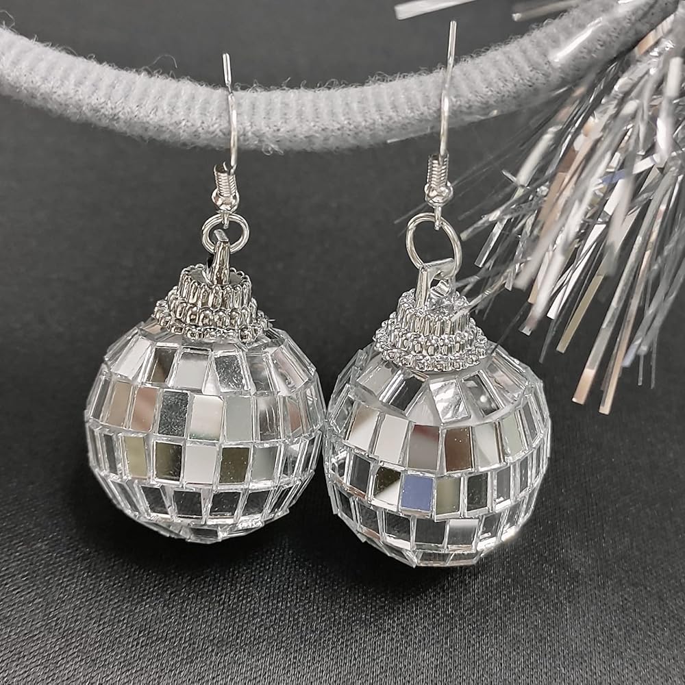 أقراط كرة مرآة عاكسة: تتميز أقراط كرة الديسكو الفضية للسيدات بتصميم كرة مرآة عاكسة للضوء، والسطح العاكس يمكن أن يجعل أقراط الديسكو المتدلية أكثر لمعانًا مثل الماس. يمكن لأقراط الديسكو العاكسة هذه أن تقدم انطباعًا كبيرًا مع أي زي أو زي.