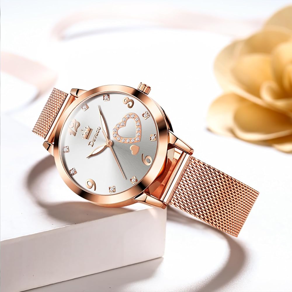 💗【 ساعة نسائية باللون الذهبي الوردي】ساعة كوارتز للسيدات: حركة الكوارتز اليابانية تحافظ على دقة الوقت ووقت السفر الدقيق. مرآة زجاجية معدنية عالية الصلابة، صلابة عالية ومقاومة للاهتراء، ليس من السهل خدشها، مع رؤية واضحة وشفافية قوية.