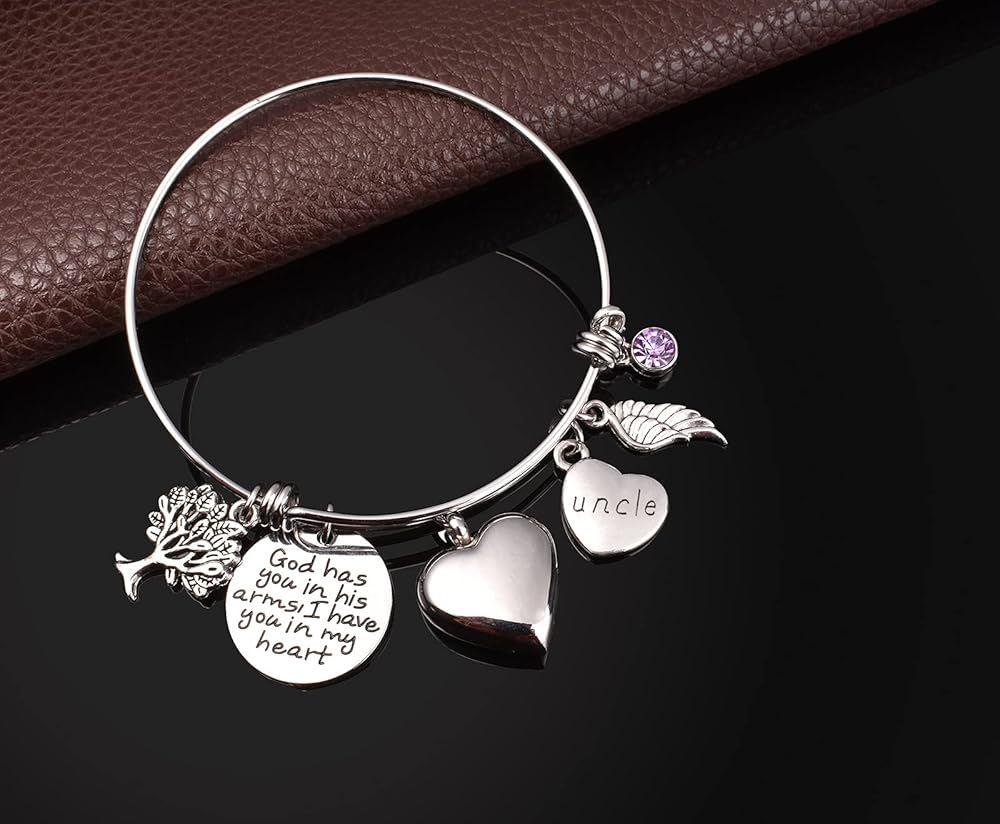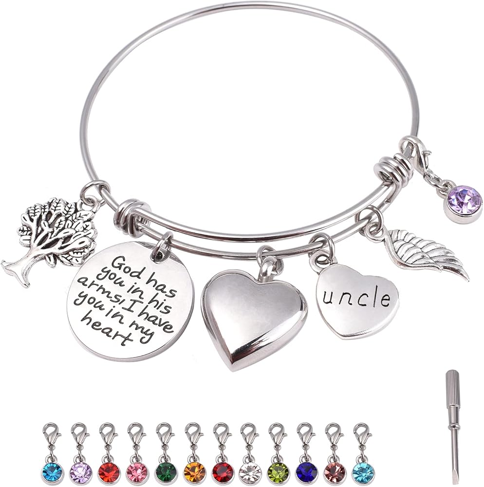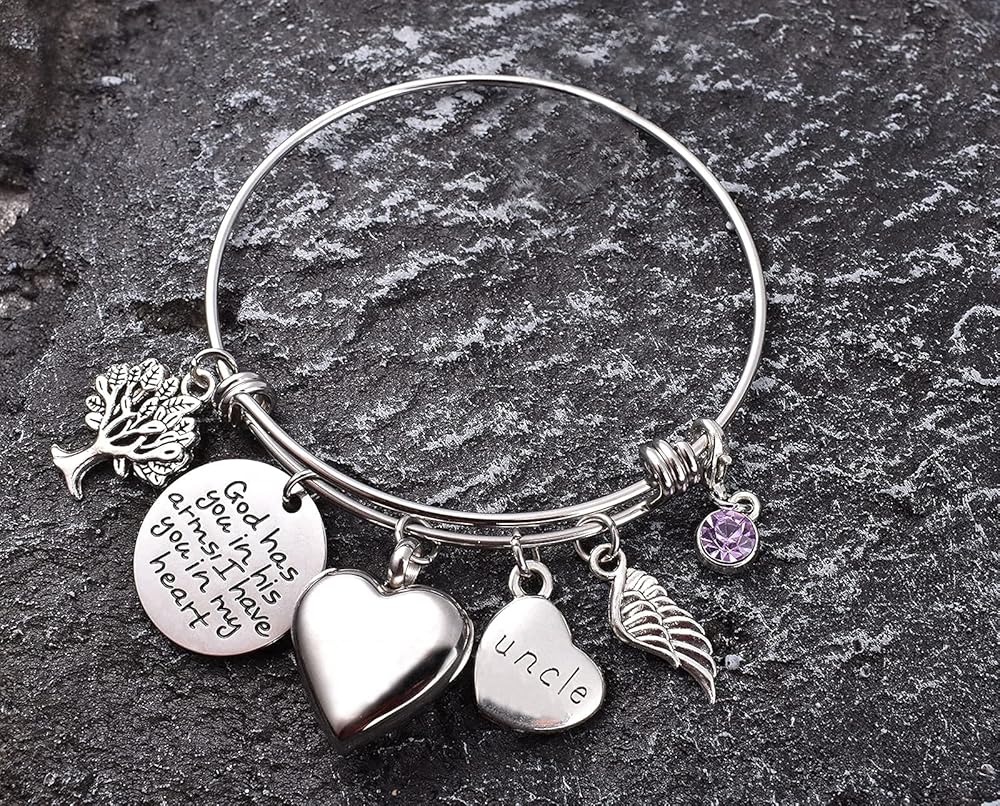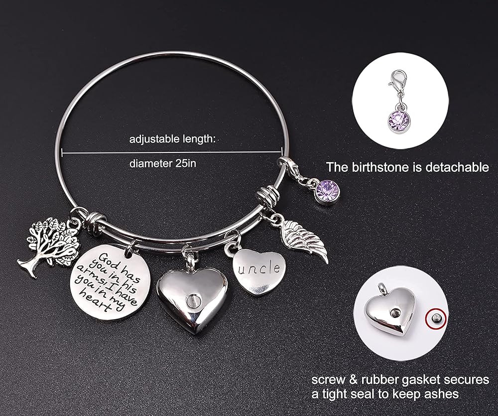 • 【سوار جرة لرماد الحيوانات الأليفة】: سوار الجرة هذا يتضمن 6 قطع ساحرة، حلية منقوشة "الله لك بين ذراعيه، لدي لك في قلبي"، حلية جرة على شكل قلب لوضع الرماد فيها، حلية على شكل قلب، مجموعة من 12 قطعة سحر جوهرة الميلاد لك لتقوم بها بنفسك، وسحر جناح الملاك وسحر شجرة الحياة.